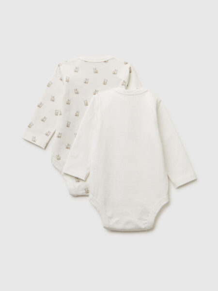 Komplet od dva bodija dugih rukava od rastegljivog organskog pamuka. Okrugli izrez i zakopčavanje na nogavicama. Jedan sa štampom logotipa napred, drugi sa štampom po celoj površini.