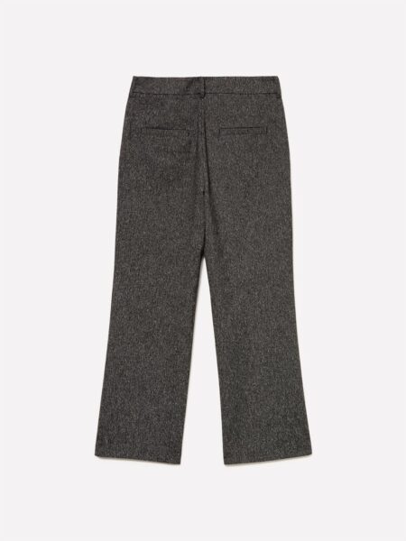 Duge pantalone od mekog, rastegljivog flanela od mešavine viskoze. Široke nogavice sa utisnutim centralnim pregibom. Struk sa prednjim otvaranjem sa rajfešlusom i dugmetom, prednjim džepovima i prošivenim džepom na leđima. Za šik i ženstvene kombinacije.
