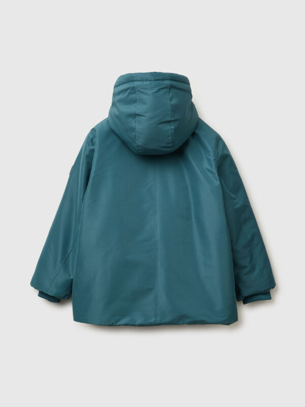 Dugačka jakna sa punjenjem od vate i podstavom od toplog flisa. Opremljena kapuljačom, umetnutim prednjim džepovima i skrivenim prednjim otvorom sa rajfešlusom i dugmadima. Udobna i prijatna, savršena za hladne dane.