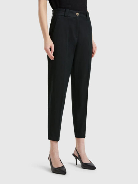 Duge pantalone od mešavine pamuka. Ravan i uski kroj sa centralno ispeglanim pregibom. Prednje otvaranje sa rajfeslusem i dugmetom, prednji džepovi i prošiveni džepovi sa dugmetom na leđima. Za moderan i ženstven izgled.
