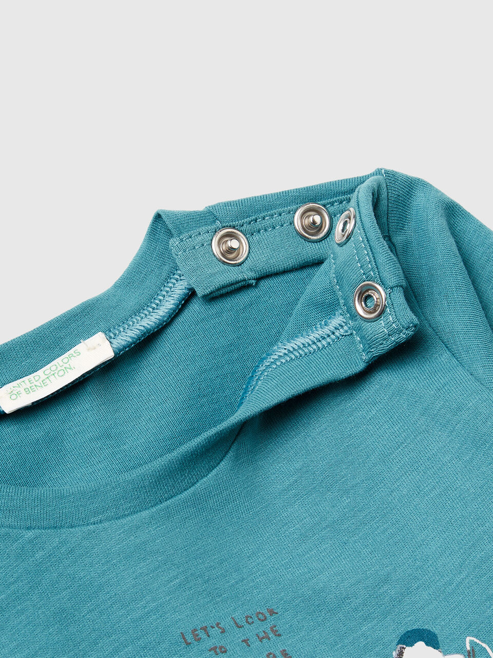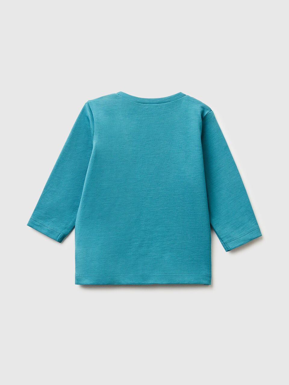 Majica dugih rukava od toplog organskog pamuka. Okrugli izrez i praktično zatvaranje sa dugmadima na levom ramenu. Šareni štampani detalji sa reljefnim detaljima na prednjoj strani.