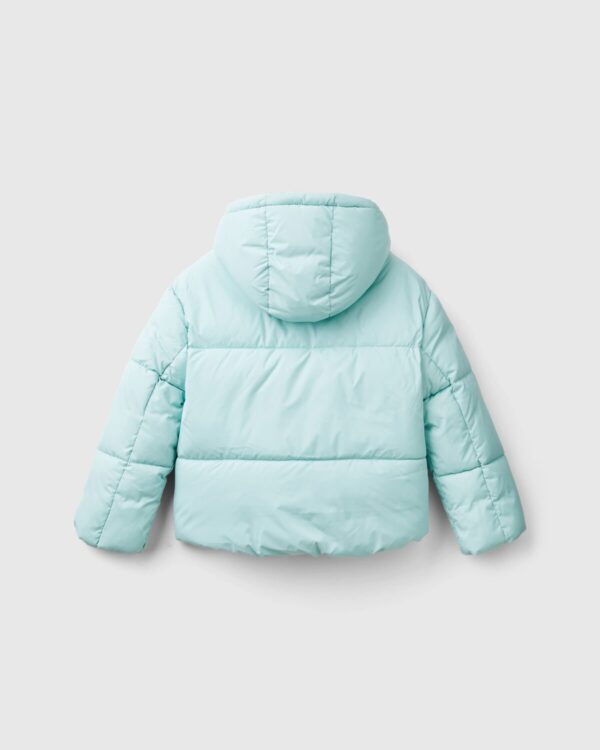 Podstavljena jakna od najlona „Rain Defender“ sa konturom od likre i dijamantskim podstavom. Topla, ali ultra lagana, sa podstavom „Duck Free“ u 3D vatu koja se uvek vraća u svoj oblik. Opremljen sa kapuljačom i prednjim džepovima. Zatvaranje rajsferšlusom sa zaštitnim rajsferšlusom i lurek logom na rukavima. Malo preveliki kroj. Komad „Easi Care“ koji se može prati u mašini i sušiti, prateći uputstva navedena na etiketi.