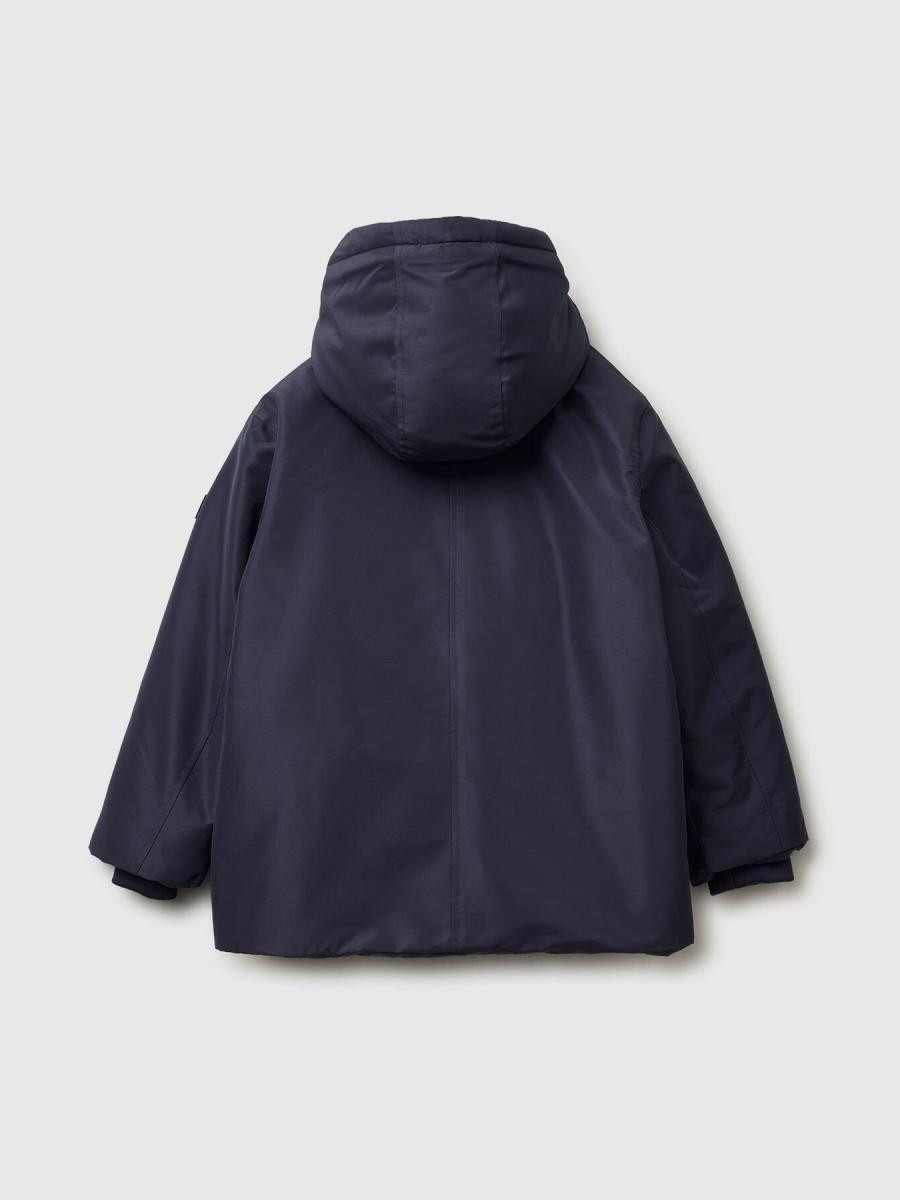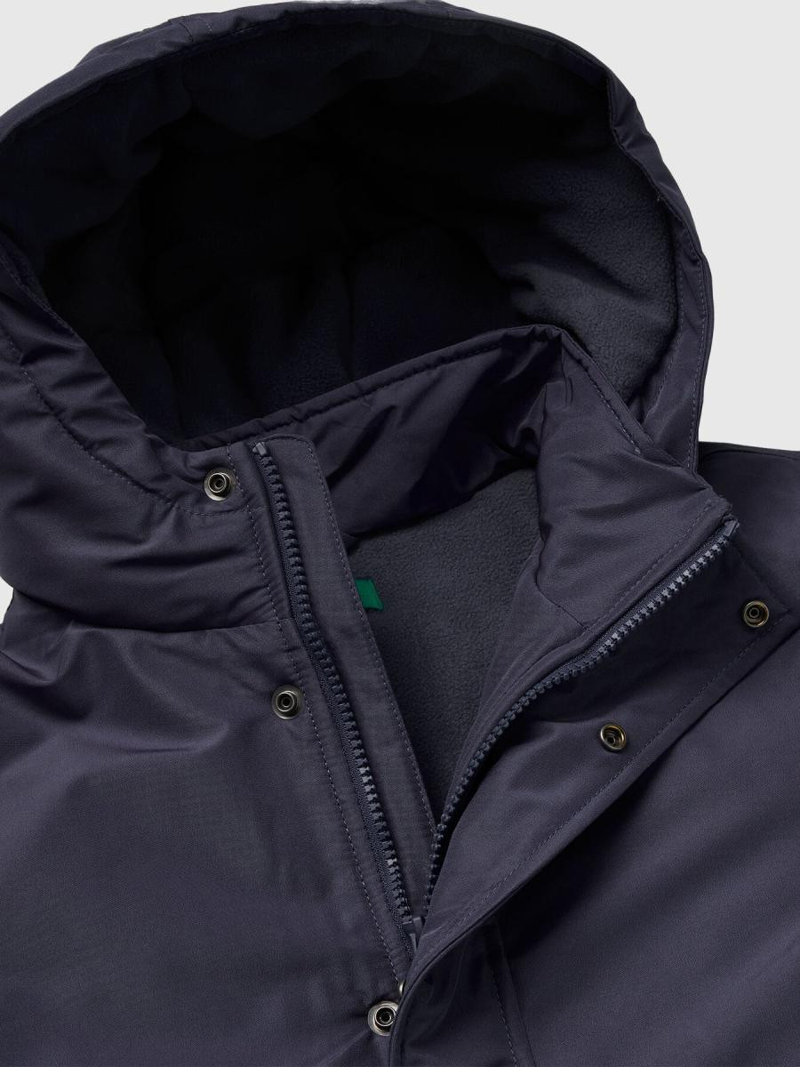 Dugačka jakna sa punjenjem od vate i podstavom od toplog flisa. Opremljena kapuljačom, umetnutim prednjim džepovima i skrivenim prednjim otvorom sa rajfešlusom i dugmadima. Udobna i prijatna, savršena za hladne dane.