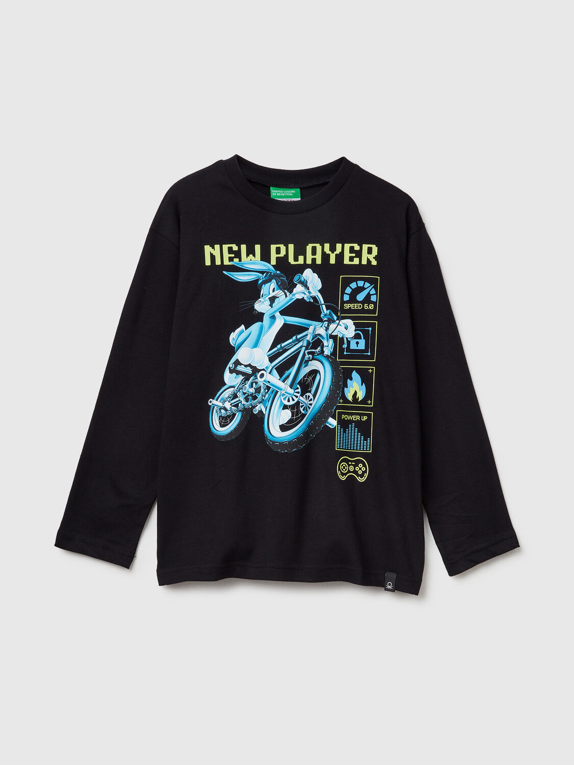 Majica dugih rukava sa okruglim izrezom od toplog organskog pamuka. Višebojni fotografski print sa gejmerskom tematikom i reljefnim detaljima.