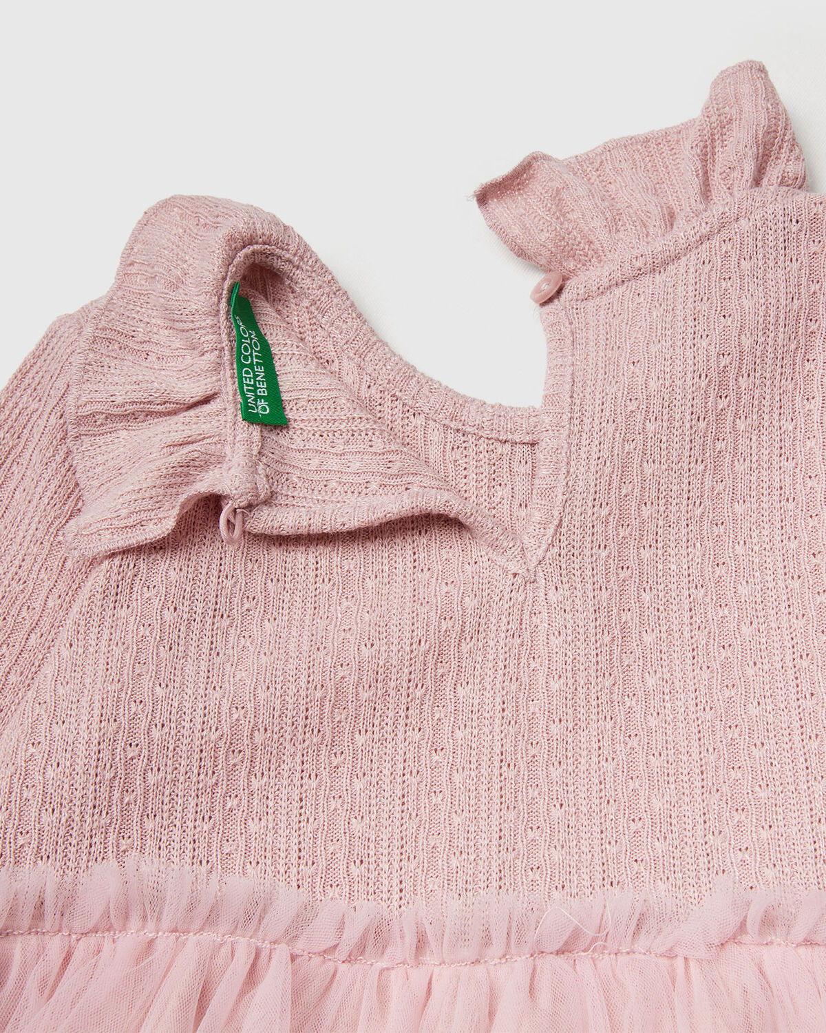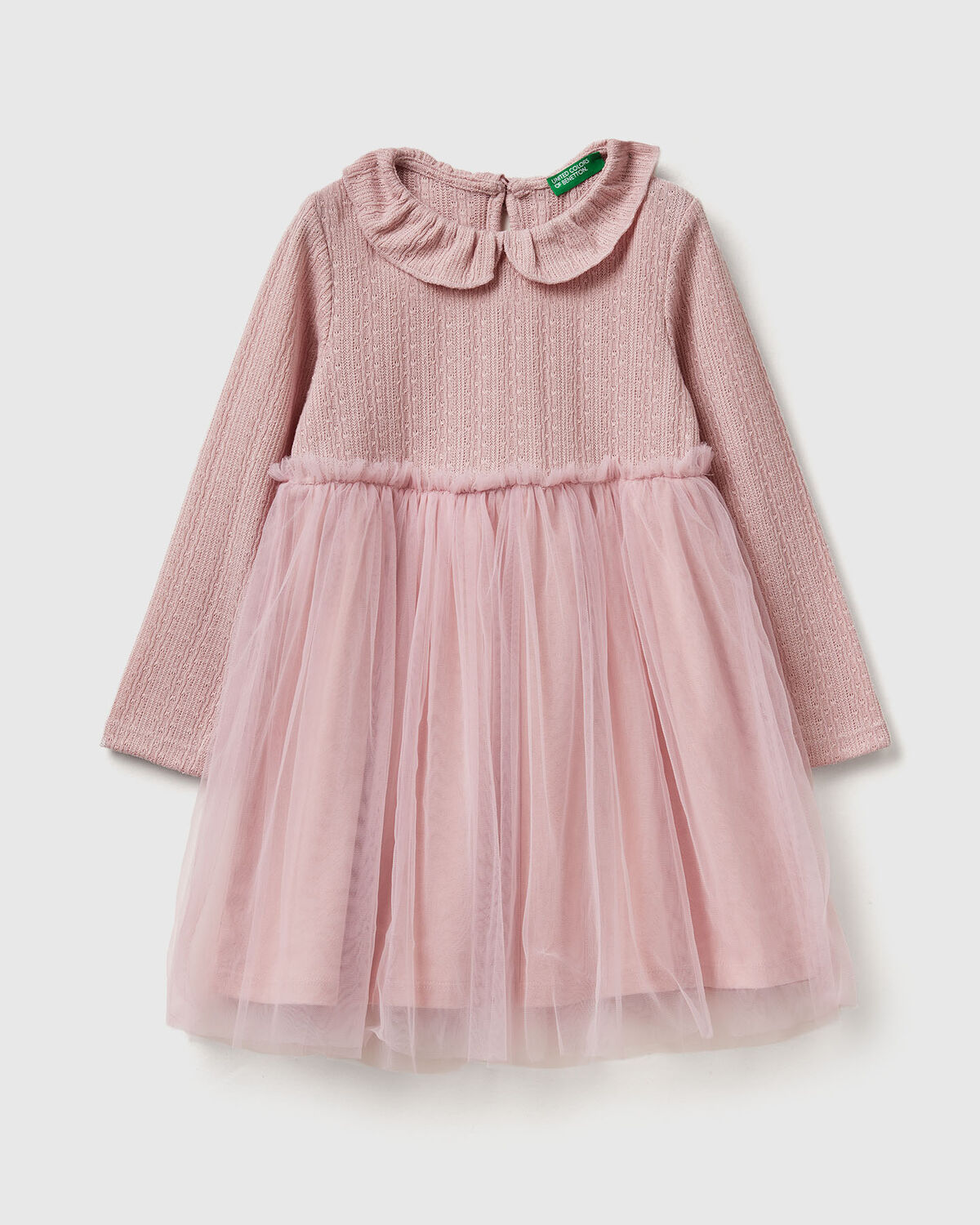 Haljina sa pletenim gornjim delom i suknjom od tila, blago labavog kroja. Kragna sa zaobljenim vrhovima, dugi rukavi i zakopčavanje na dugmad na leđima. Idealna za svečanosti i posebne prilike.