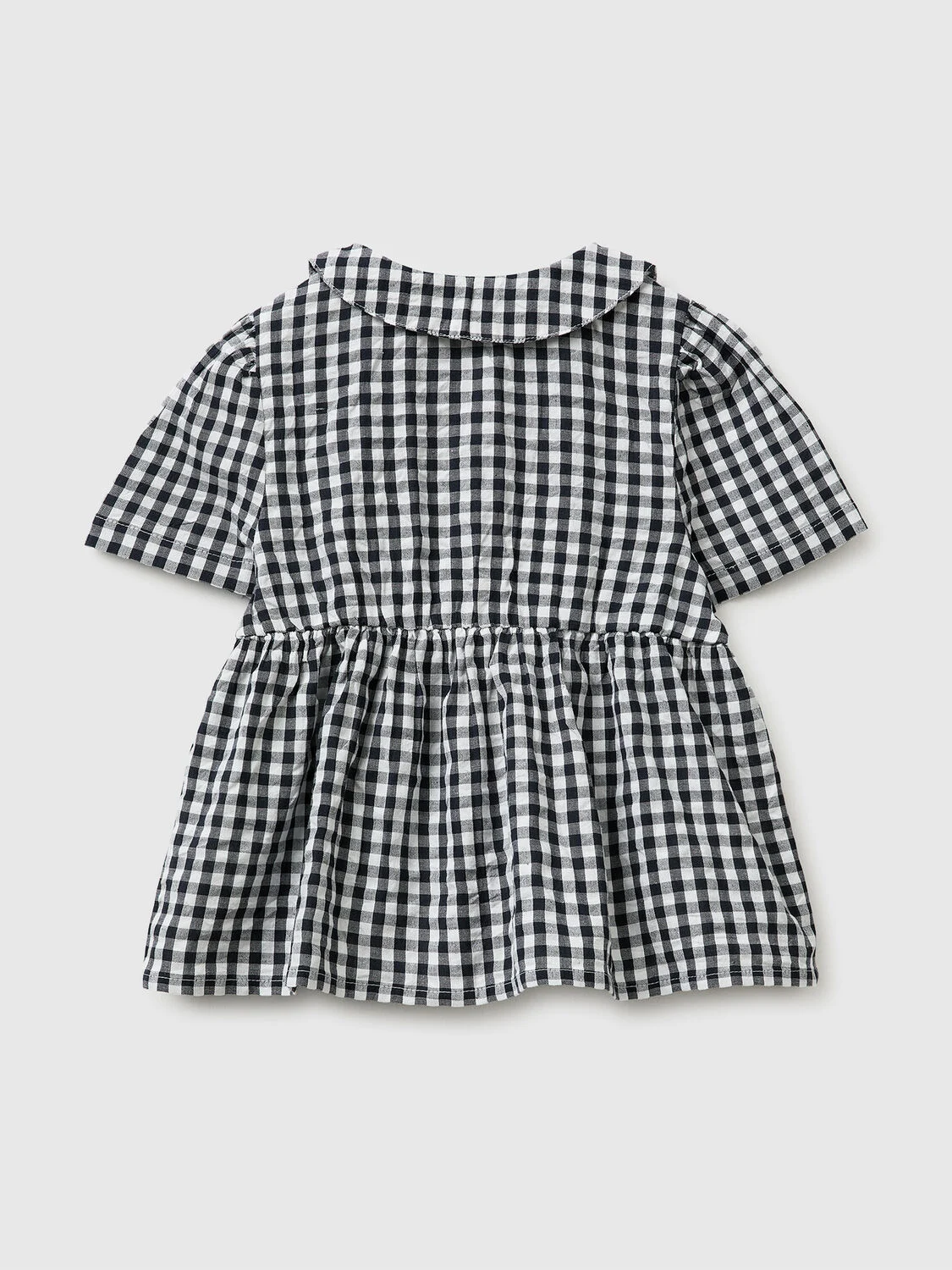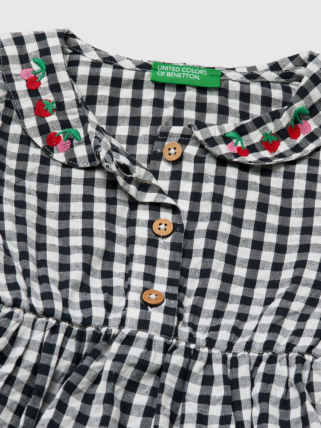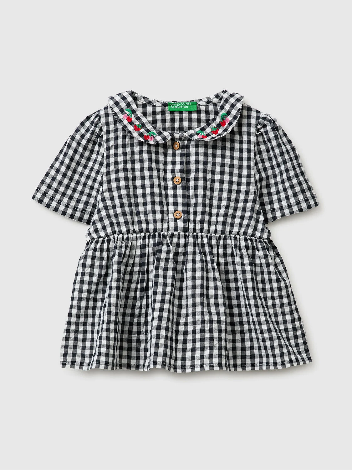 Bluza kratkih rukava od čistog pamuka sa teksturiranim, obojenim kariranim izgledom. Okrugla kragna sa vezom sa voćem i delimičnim zakopčavanjem na dugmad. Elastični deo ispod grudi stvara blago naboranje. Ženstveno i romantično.