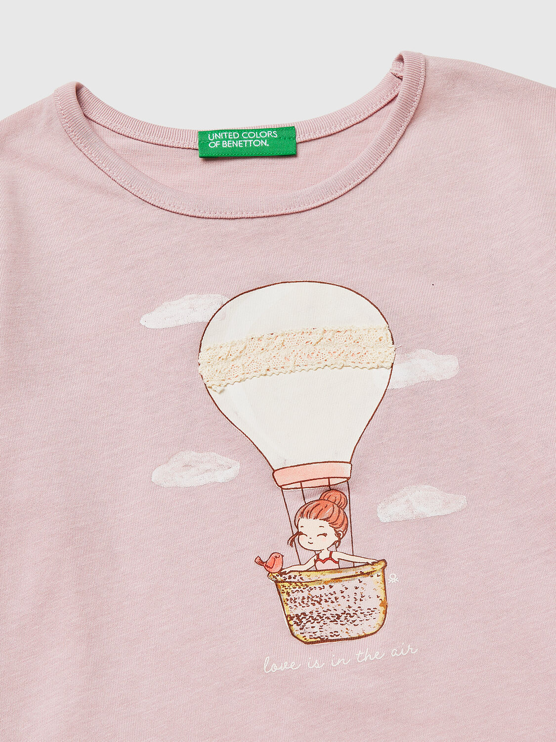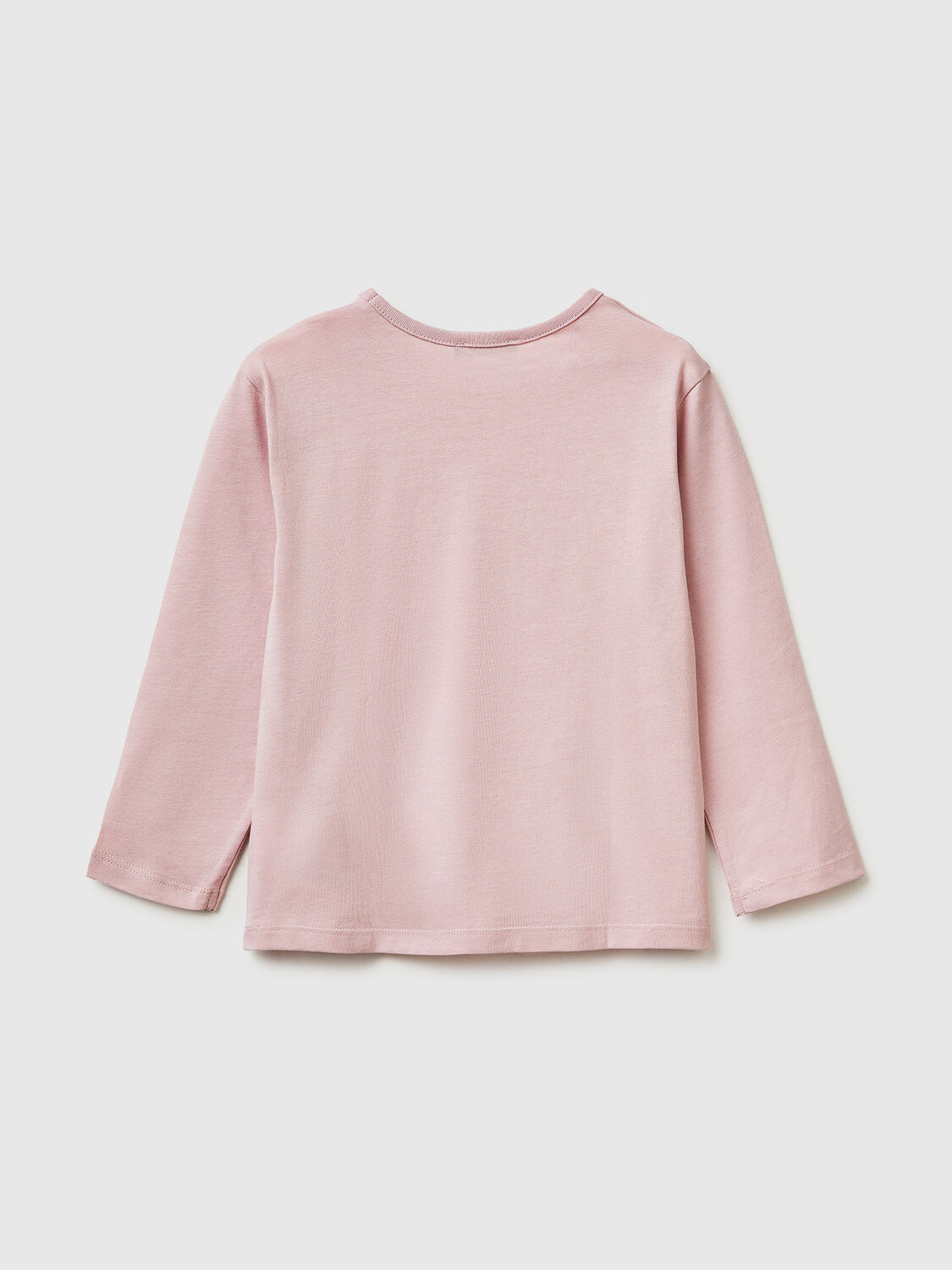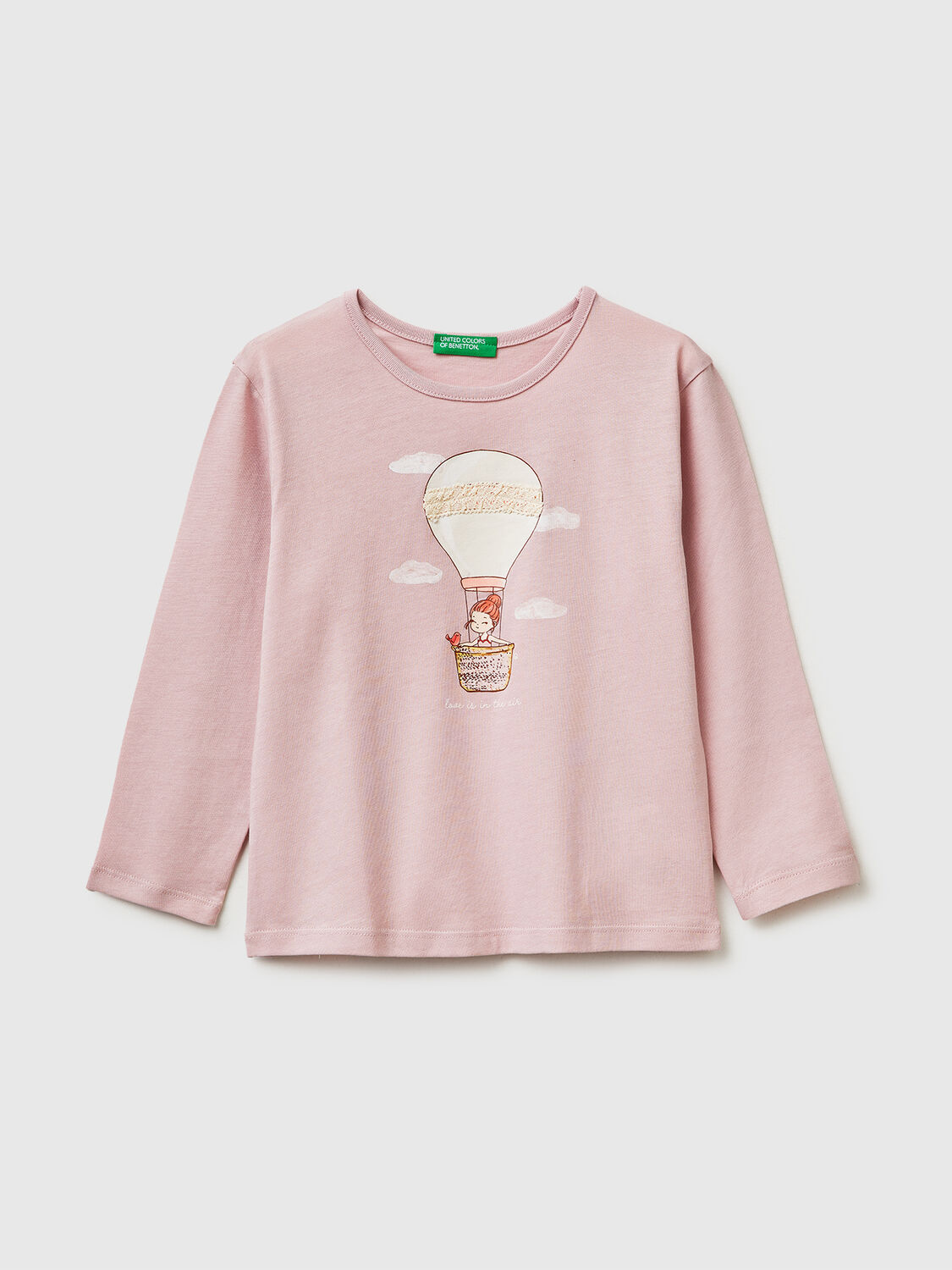 Majica sa okruglim izrezom, dugim rukavima i štampom na prednjoj strani sa trodimenzionalnim aplikacijama.