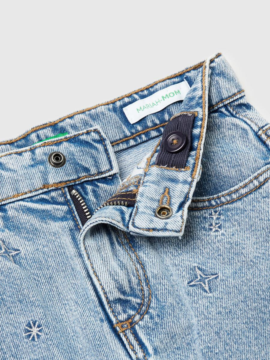 Duge pantalone „mom kroj“ od čistog pamučnog teksasa. Model sa pet džepova i prednjim otvaranjem rafflešusem i dugmetom. Lureks vez u struku. Kul, moderan komad.