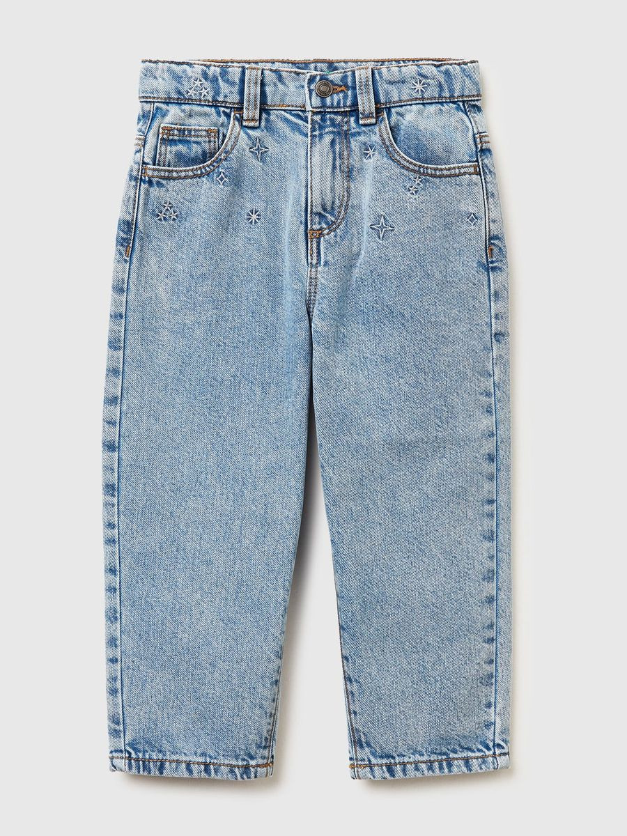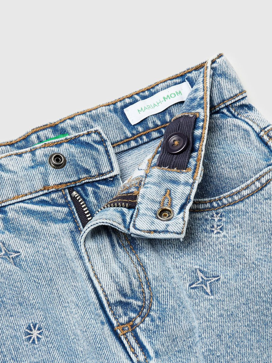 Dugačke pantalone za mamu od čistog pamučnog teksasa. Dizajn sa pet džepova i prednjim otvaranjem sa patent zatvaračem i dugmetom. Lureks vez u struku. Kul, moderan komad.