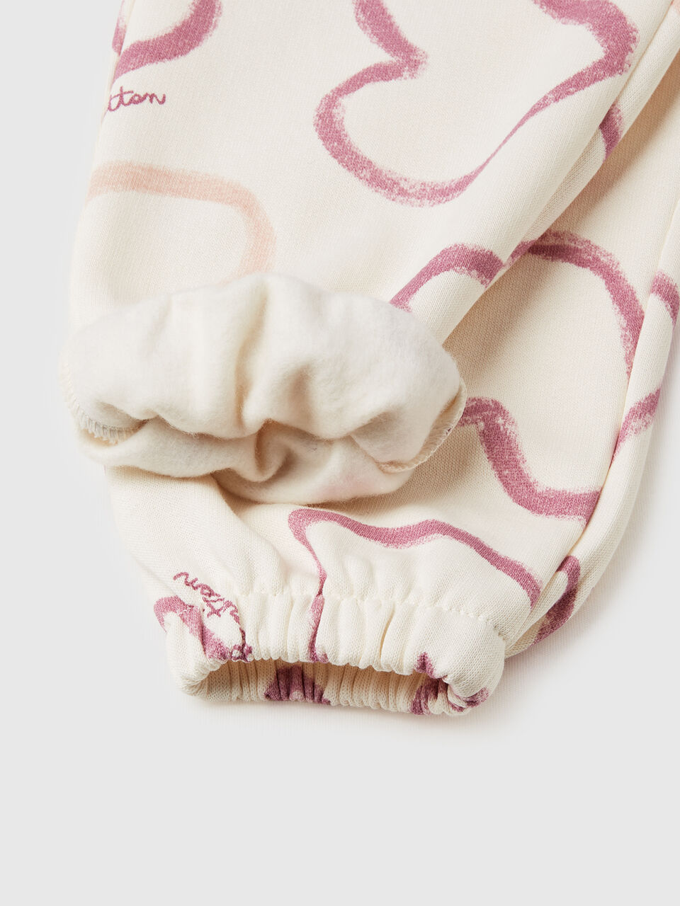 Trenerka od meke pamučne mešavine koja pruža topao osećaj. Elastični struk sa vezicom za zatezanje i džepovi napred. Podesivi kroj sa unutrašnjom lastišom na dnu. Slatki print srca po celoj površini, za beg od dosade.