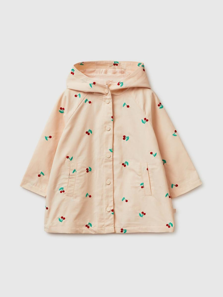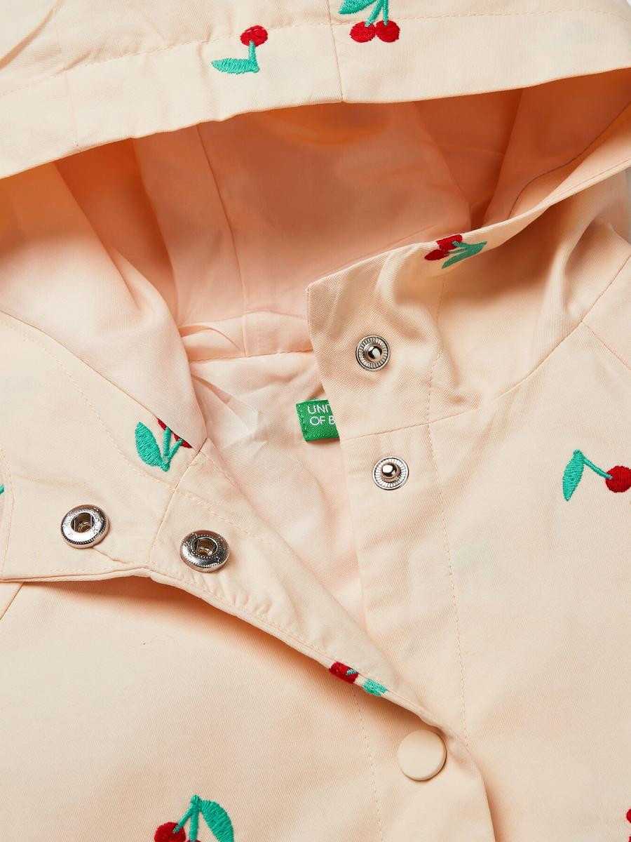 Jakna od mešavine pamuka sa vezom višnje po celom delu. Kapuljača, visoka kragna i prednja strana sa dugmićima. Dugi raglan rukavi i prednji džepovi sa prelivom. Savršeno za prelazno vreme.