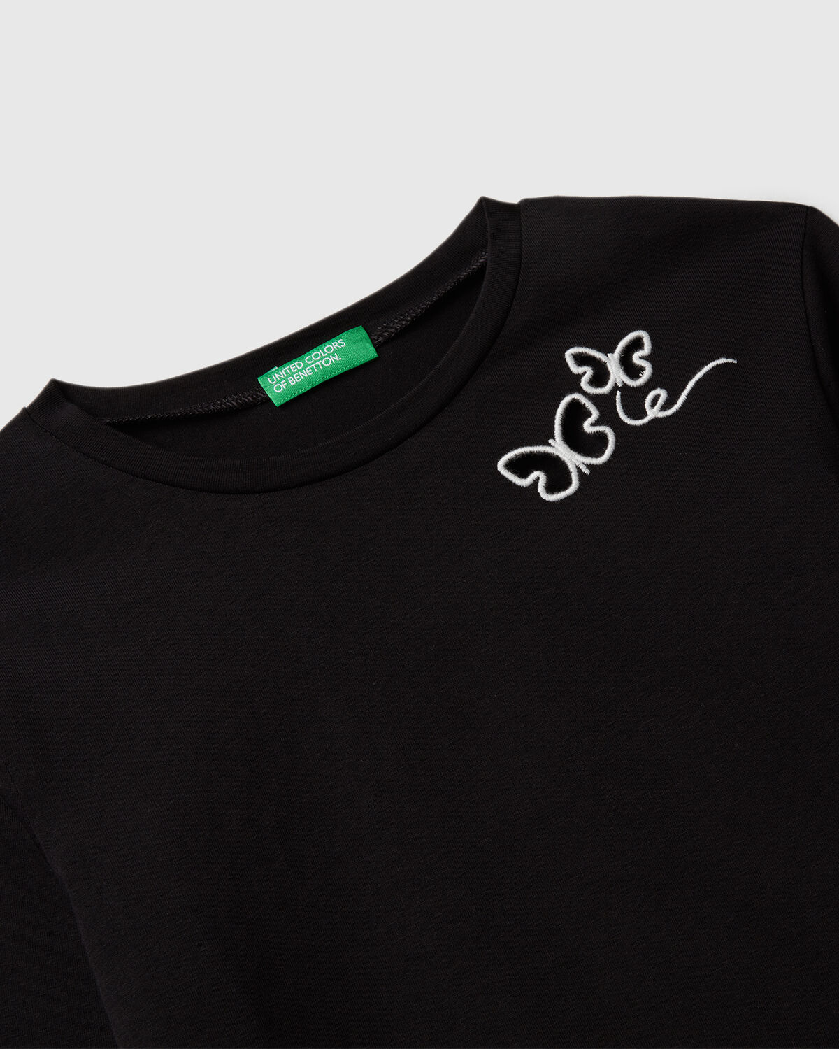 Majica dugih rukava od rastegljivog organskog pamuka. Okrugli izrez sa izrezom u obliku leptira. Ženstven, romantičan i svakodnevni komad odeće.