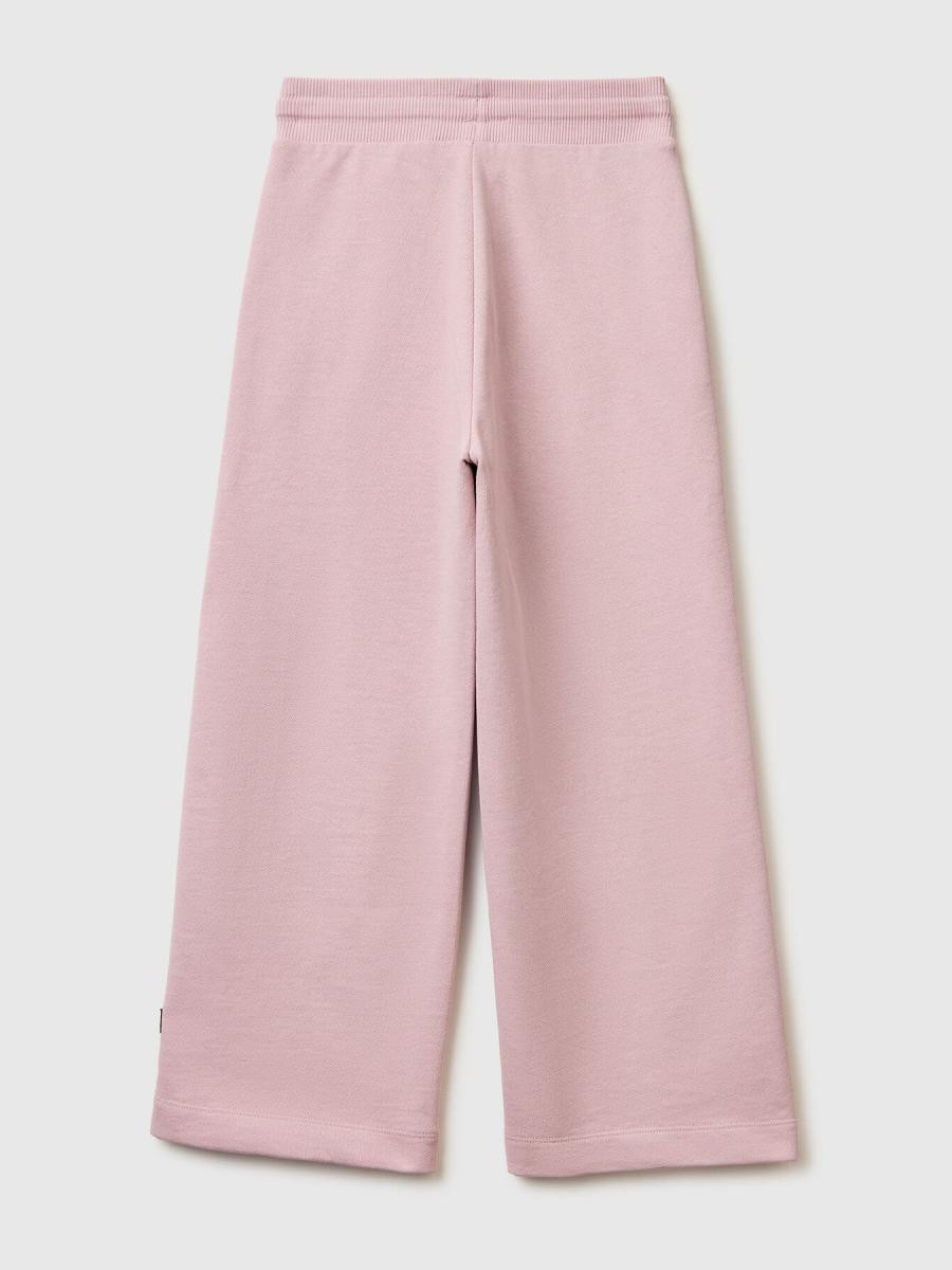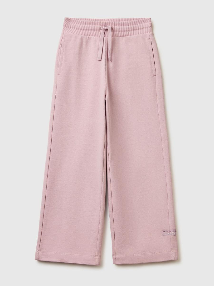 Duge trenirke od čistog pamuka. Rebrasti pojas sa vezicom, široke nogavice i umetnuti bočni džepovi. Savršeno za školu i slobodno vreme.