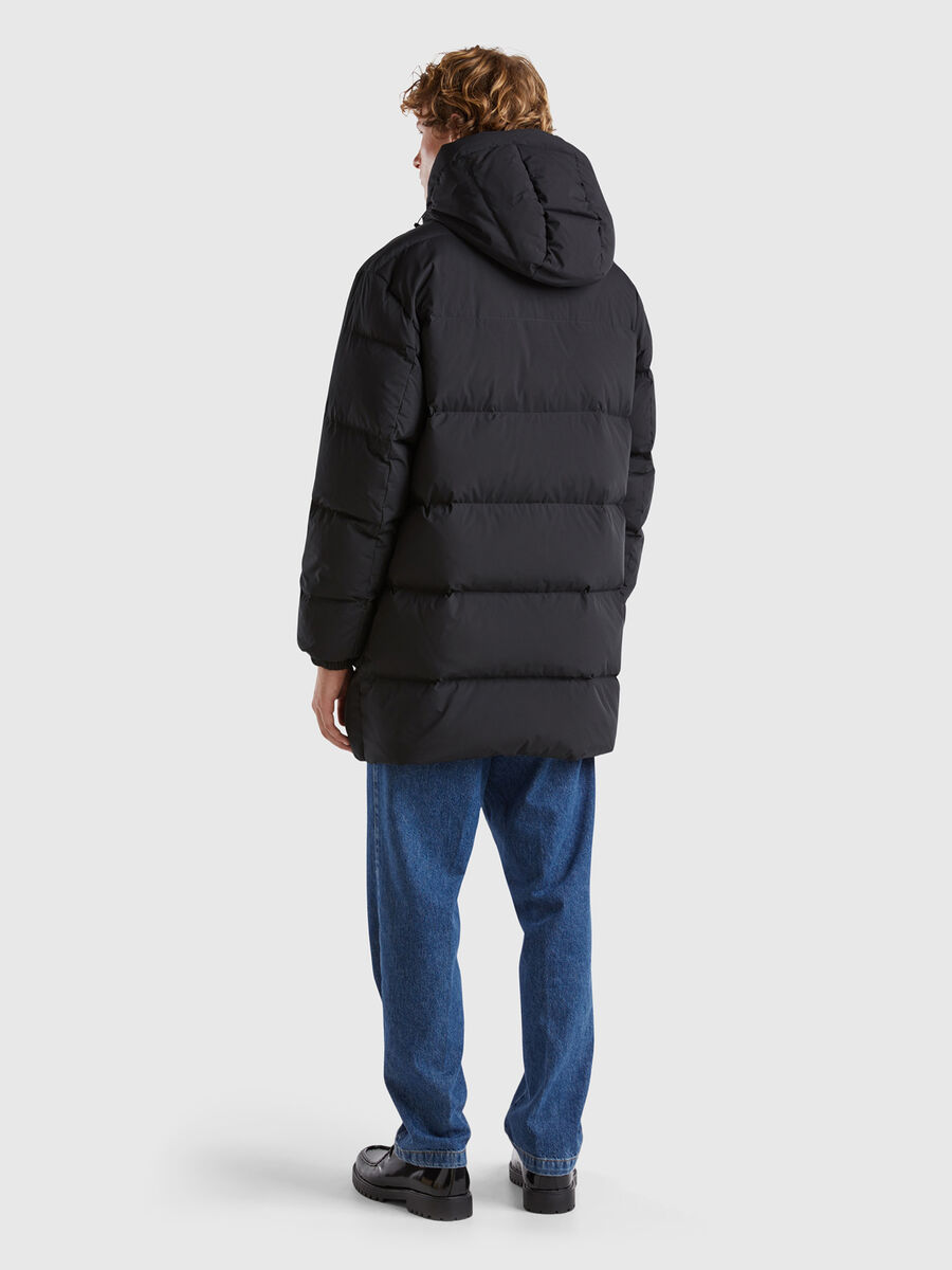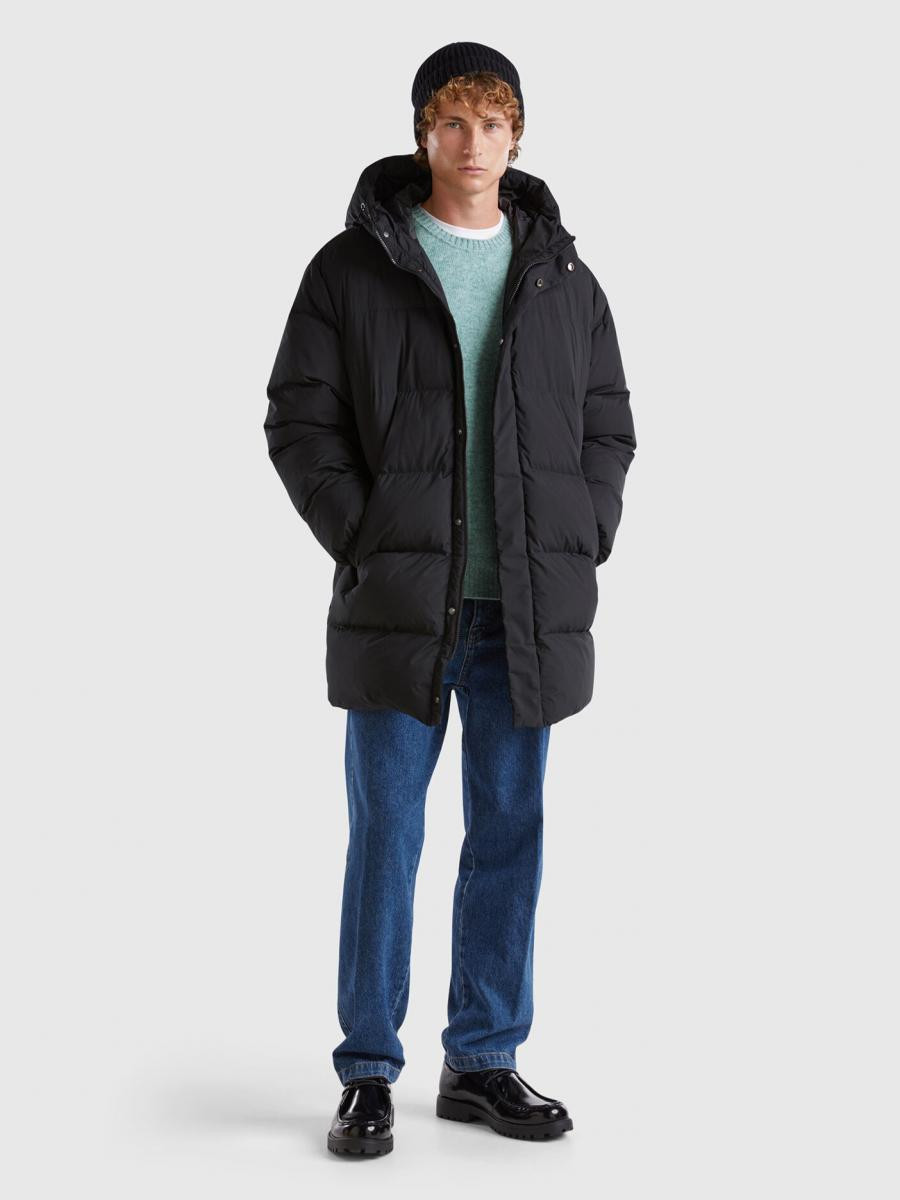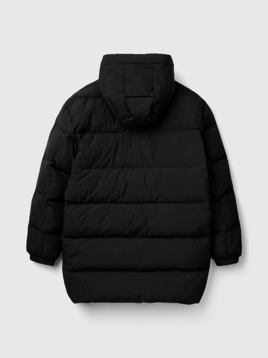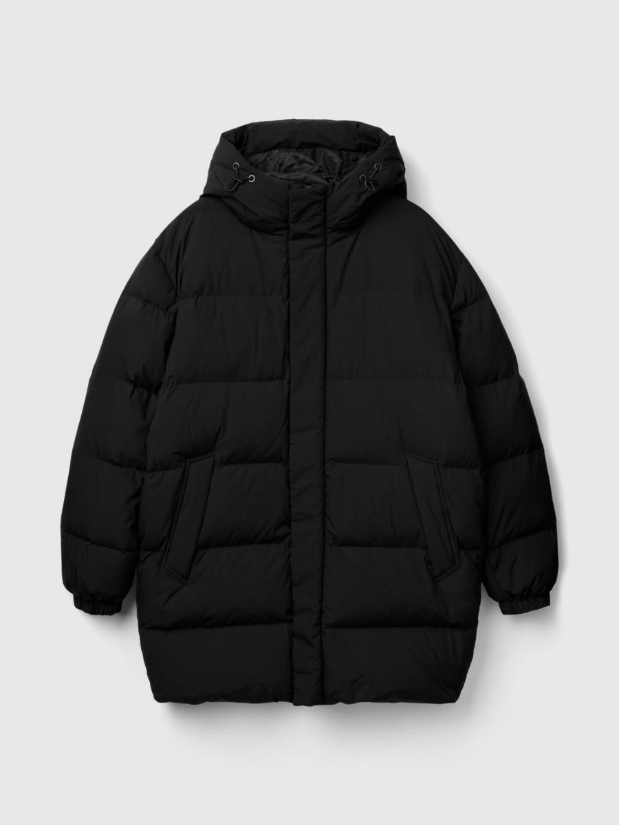 Dugačka jakna od tehničke tkanine „Rain Defender“ sa horizontalnim prošivenjem. Punjenje od perja i pravo reciklirano perje. Sa kapuljačom i kanapom, zatvaračem za uže, skrivenim otvorom do brade sa rajfeslusem i dugmadima, umetnutim bočnim džepovima sa preklopom i dugmadima. Topla, udobna i prijatna, savršena za najhladnije dane.