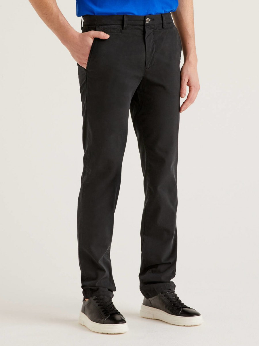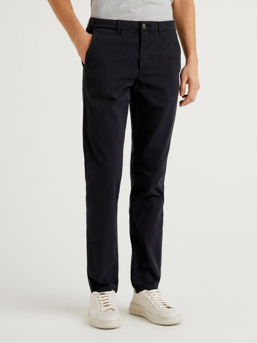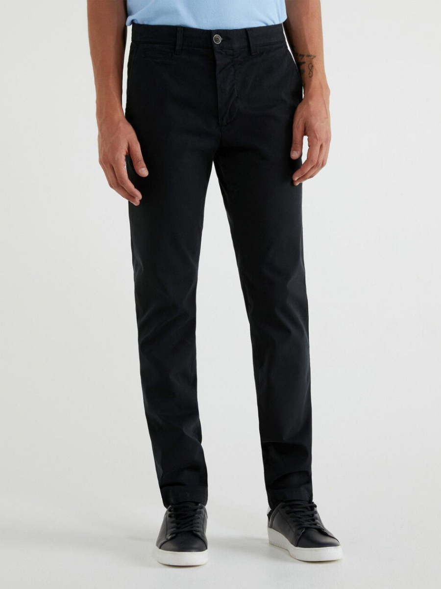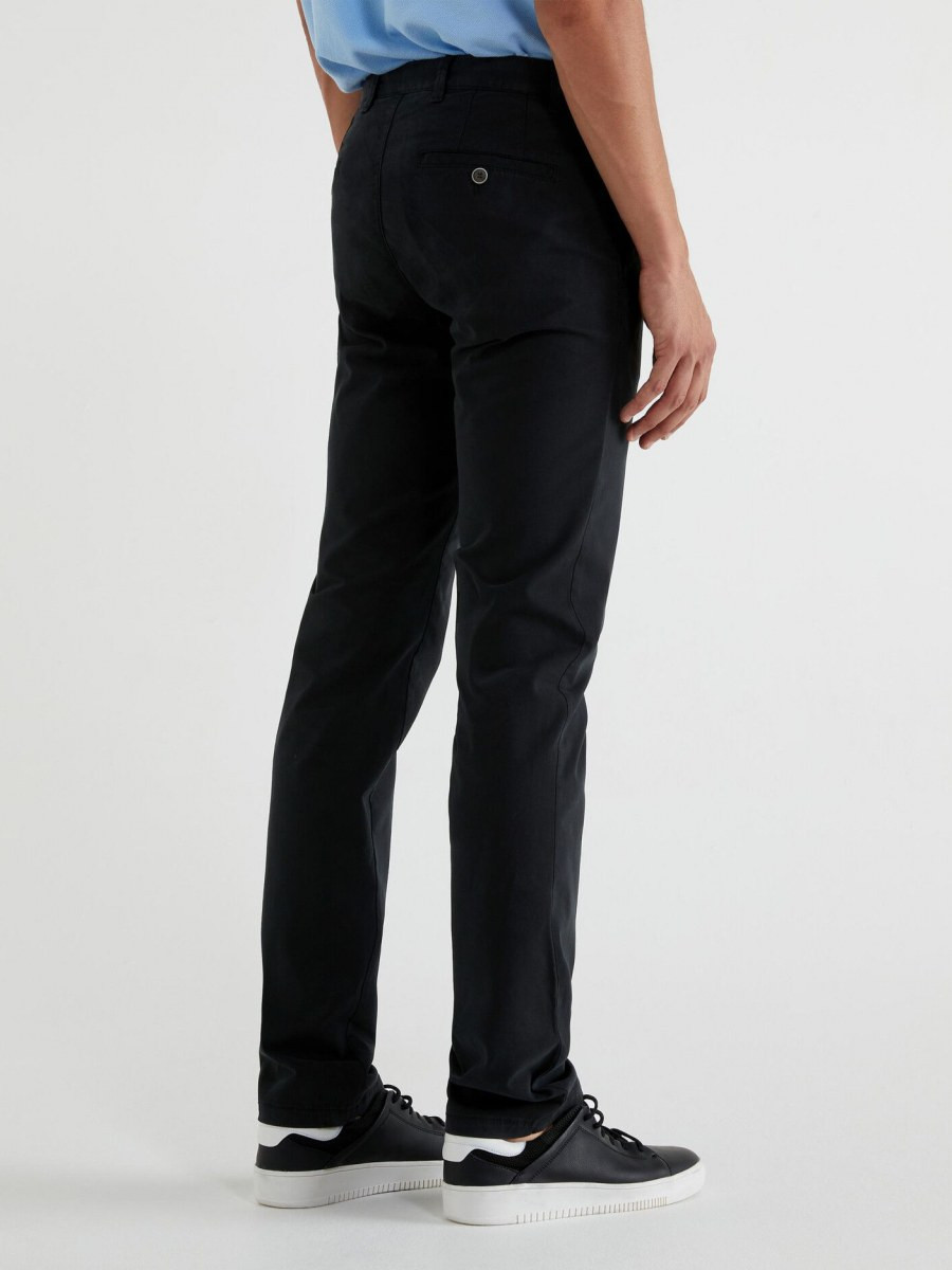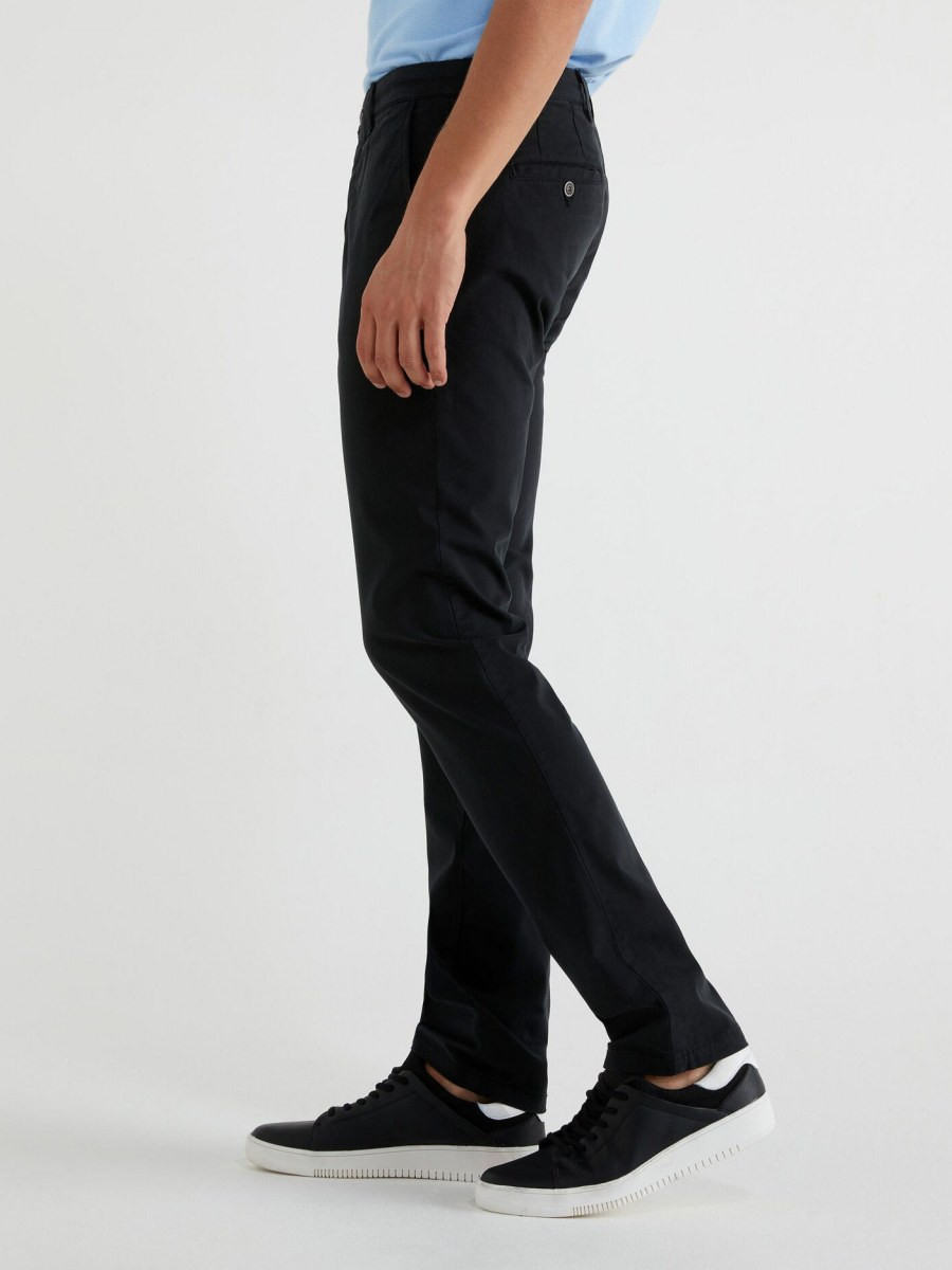 Duge čino pantalone od rastegljivog pamuka uskog kroja, pogodne za kancelariju i slobodno vreme. Prednji i zadnji džepovi, dodatni džep napred, nabori pozadi i omče za kaiš u struku za ležeran izgled.