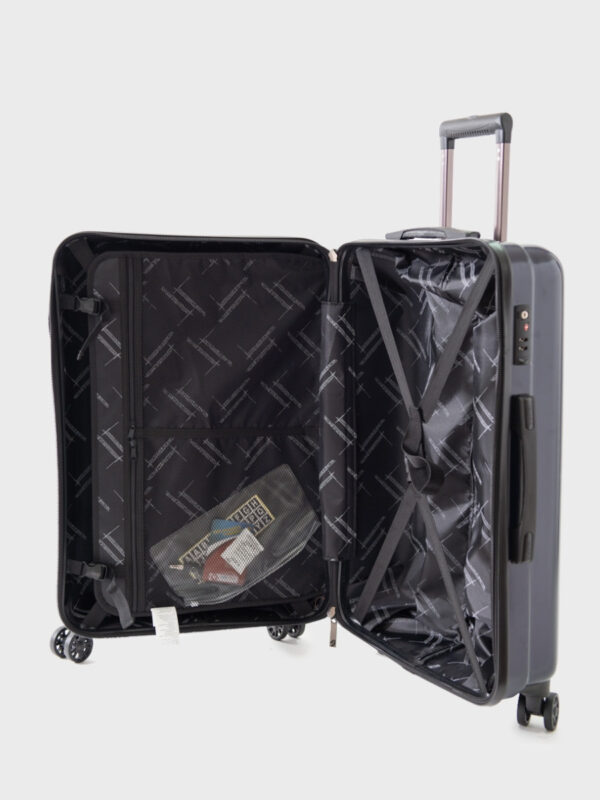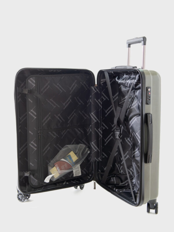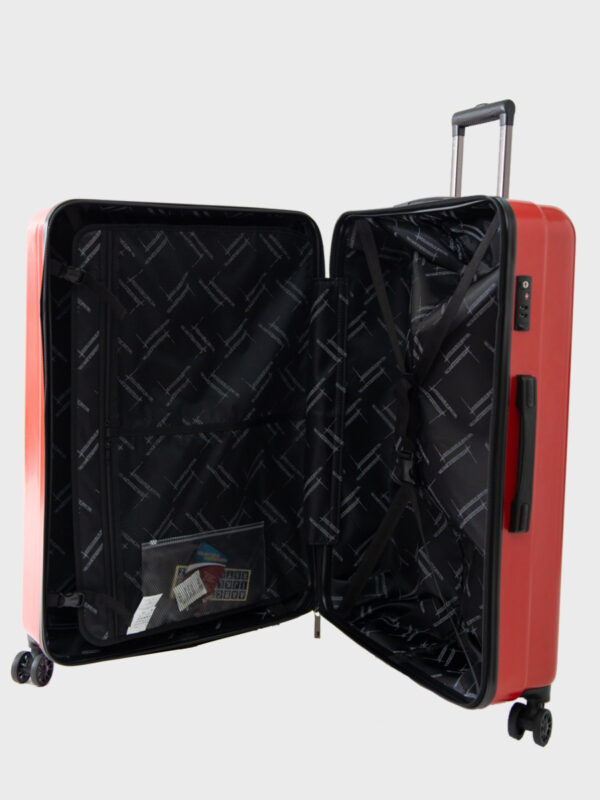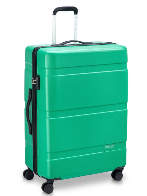 Benetton kofer srednje veličine sa četiri točkića 100% poliester sa adaptabilnom drškom obložena tkaninom zbog lakšeg transporta. Gornja strana kofera ima višestruke funkcionalne pregrade. Dimenzije: 68x43x27cm. Litraža: 78lt. Težina: 2,9kg.