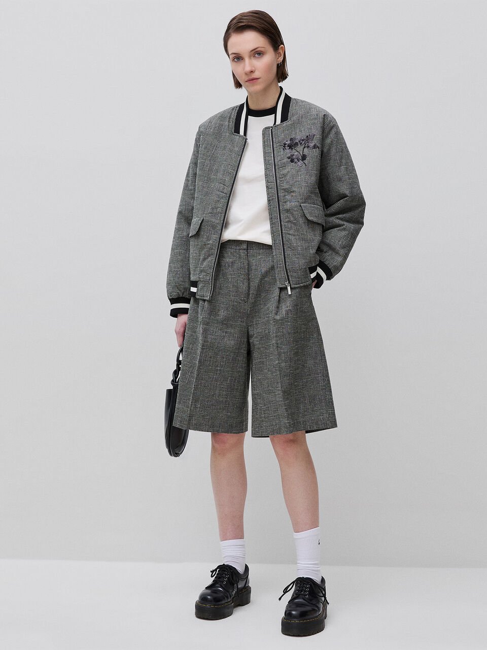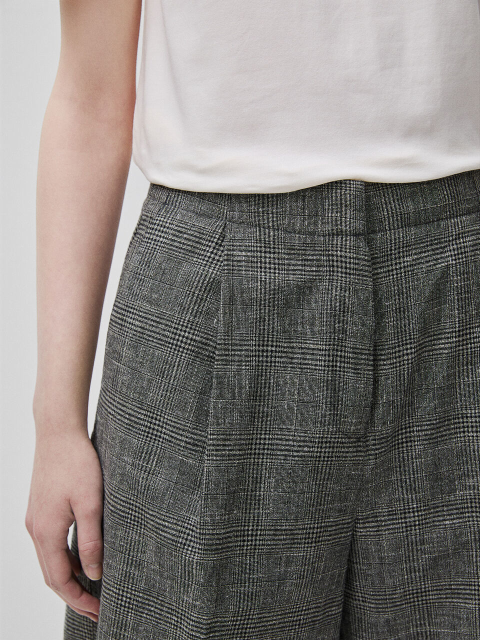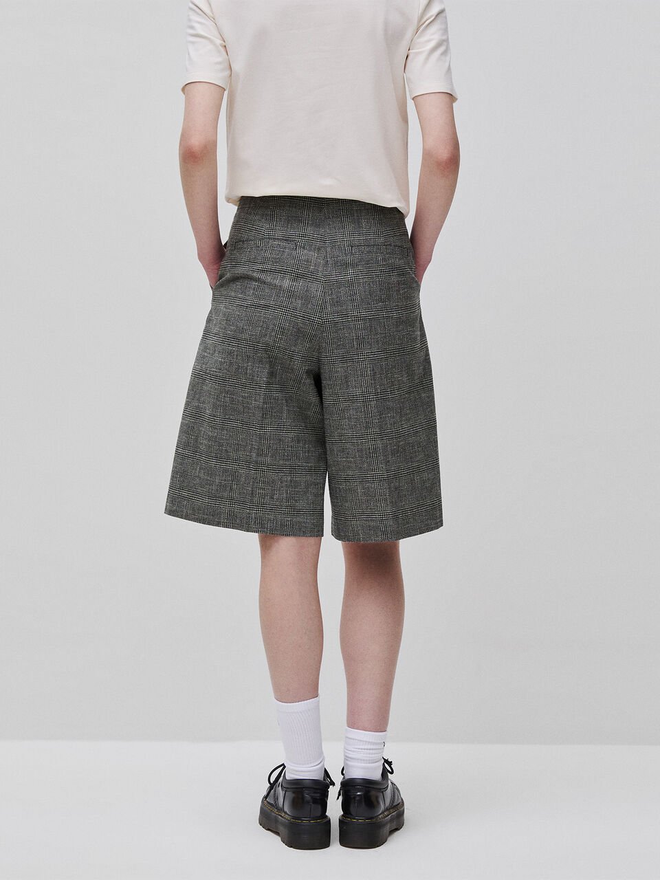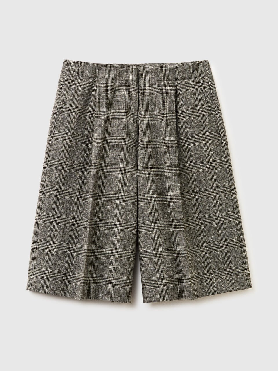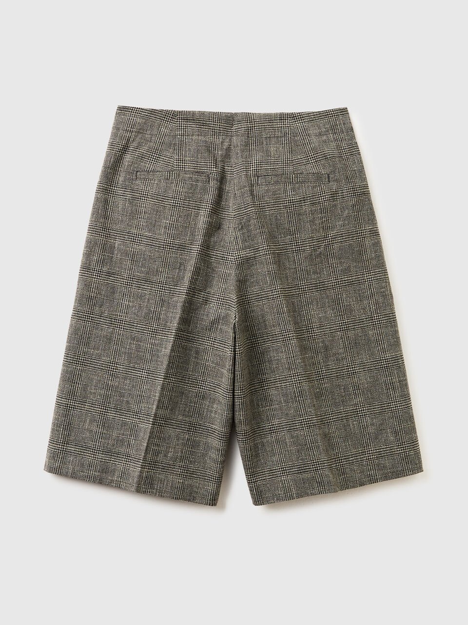 Bermude od mekog pređe obojenog pamukom i lanom u kombinaciji sa uzorkom Princa od Velsa. Skriveni rajsferšlus, kopčanje na kuku i dugmad, bočni džepovi i džepovi sa prelivom na leđima. Opuštena noga do kolena, za modernu urbanu odeću.