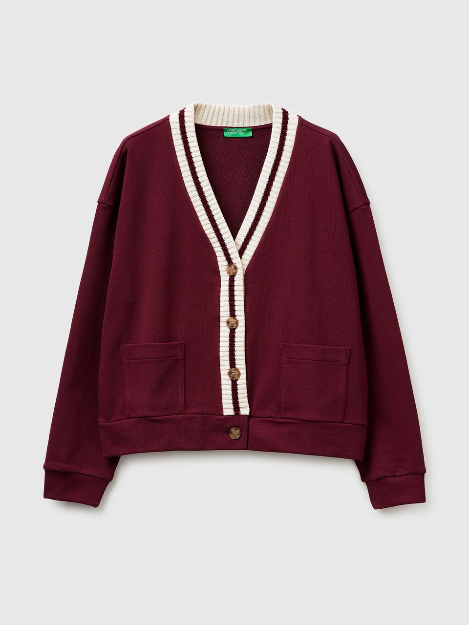 Kardigan sa V-izrezom sa kopčanjem na dugmad od elastičnog pamučnog flisa. Opuštenog kroja sa spuštenim ramenima i prednjim džepovima. Prugasti rebrasti detalj na izrezu i otvoru. Eklektična mešavina sportsko-ležernih elemenata sa šik potezom.