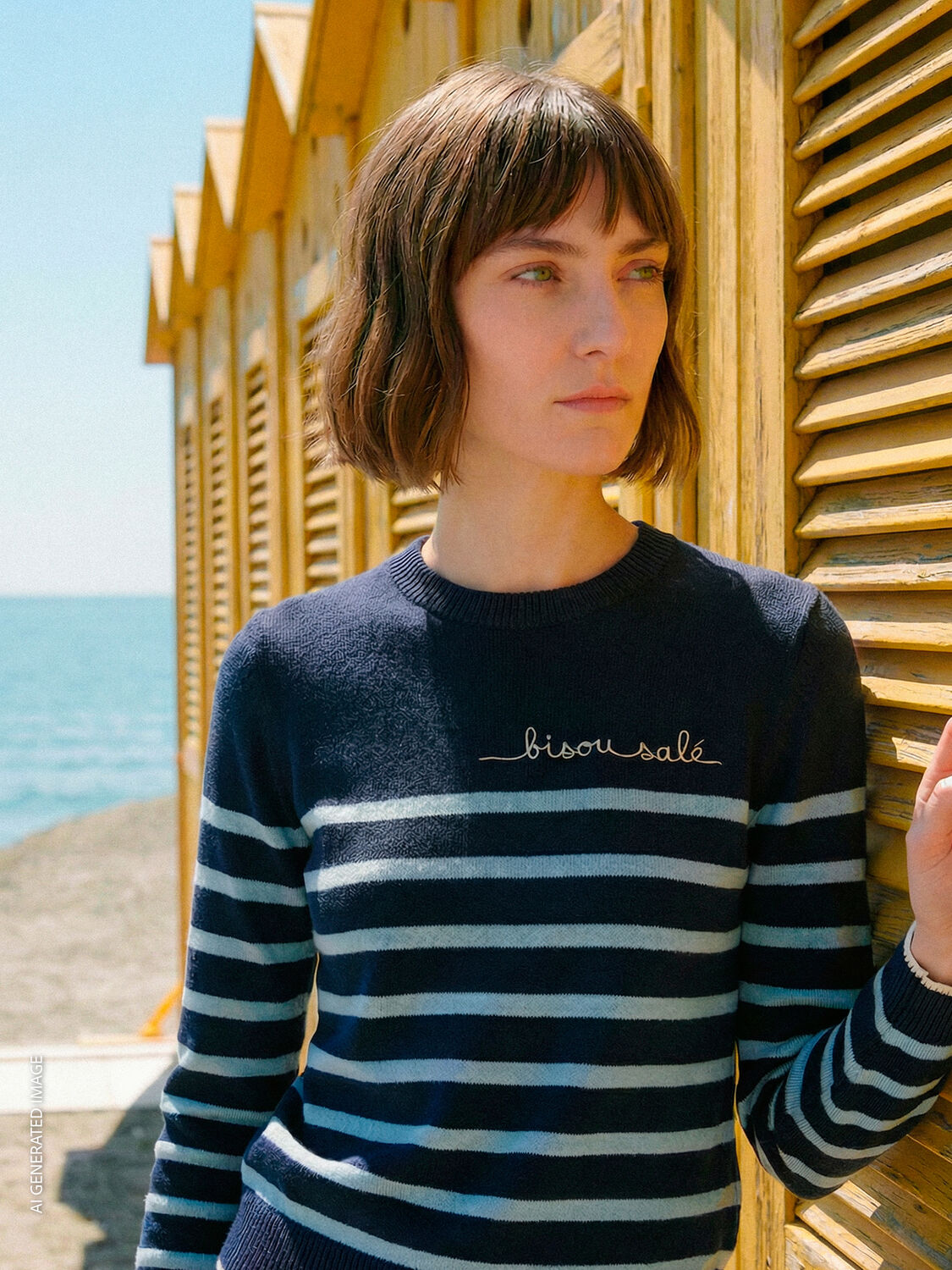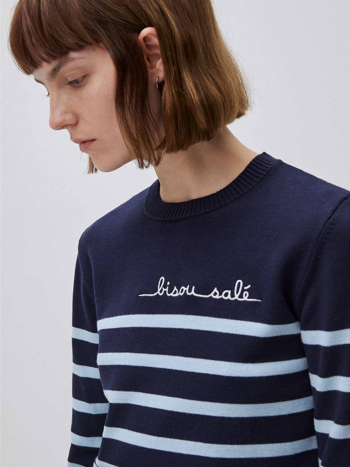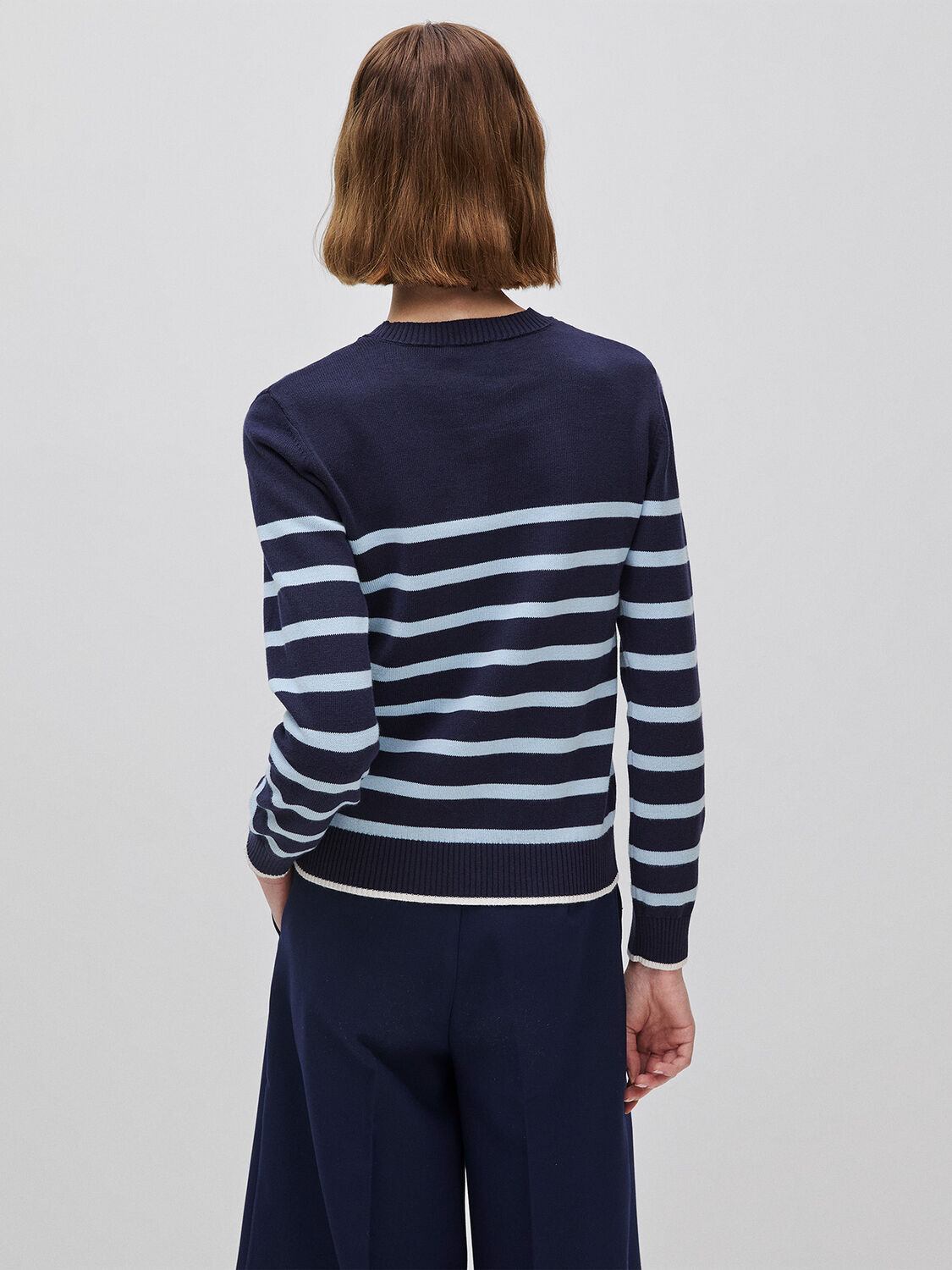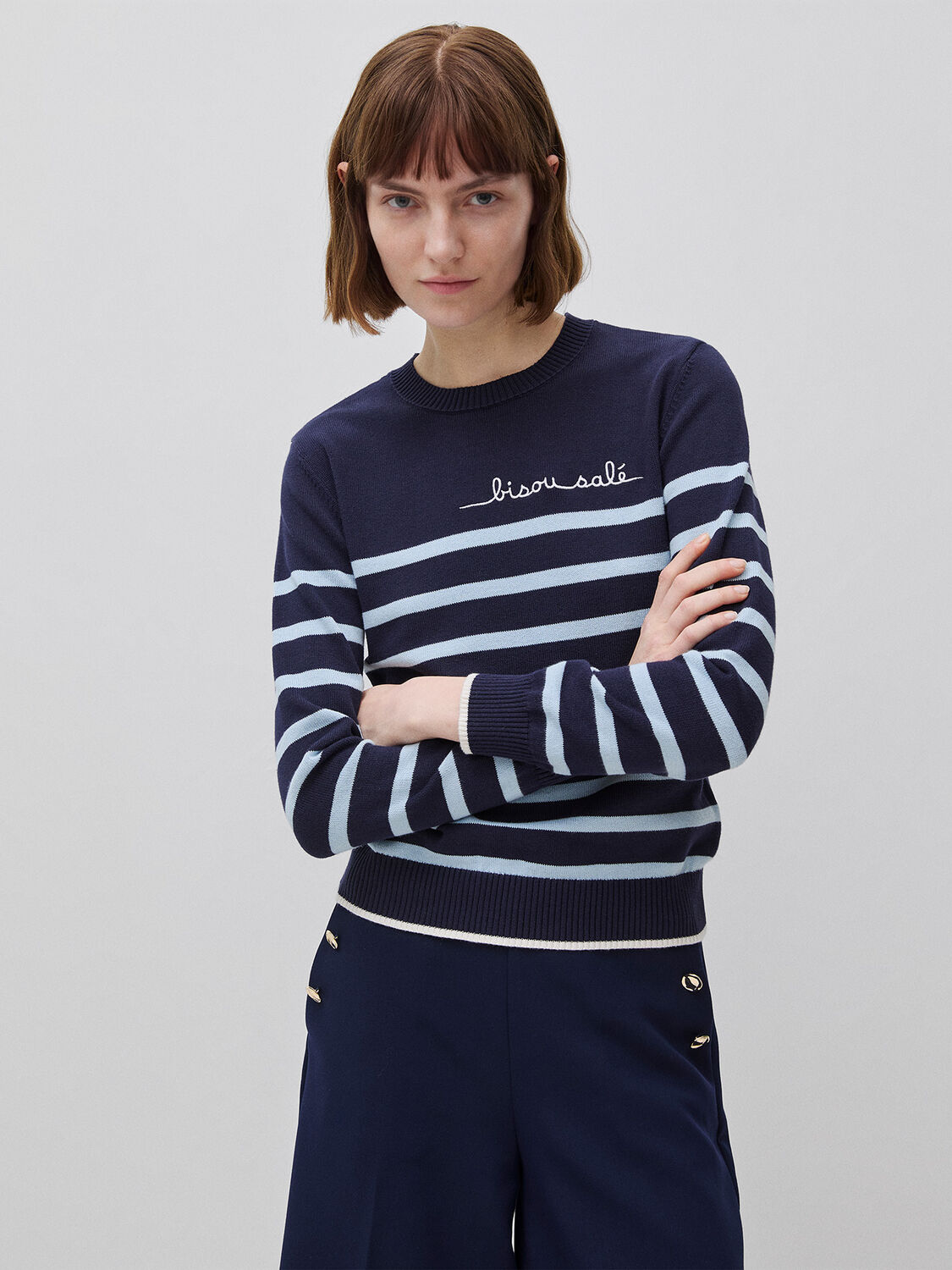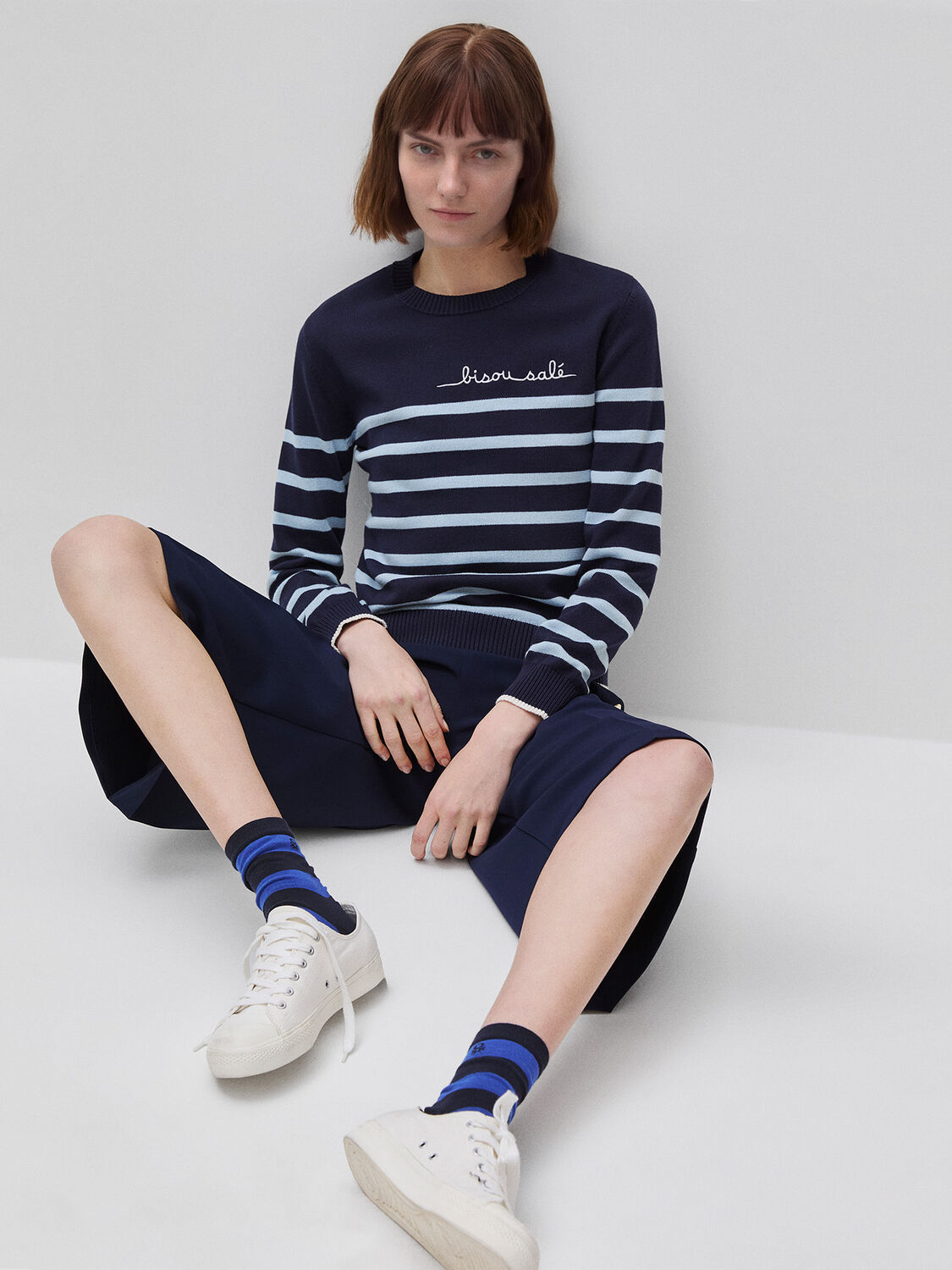 Džemper sa okruglim izrezom dugih rukava od čistog pamuka opuštenog kroja. Sa prugastim dizajnom na telu i rukavima i vezenim slovima na grudima. Ženstveno sa dodirom šika.