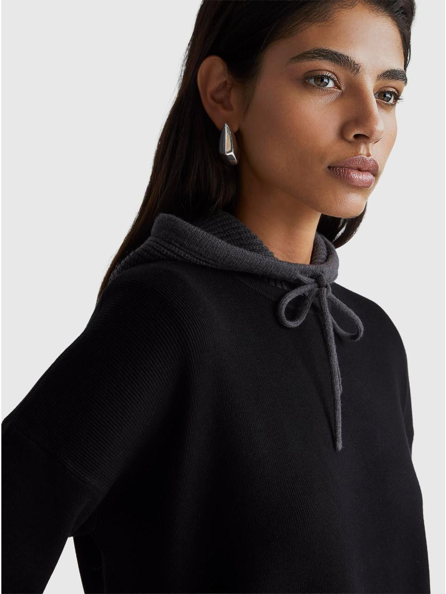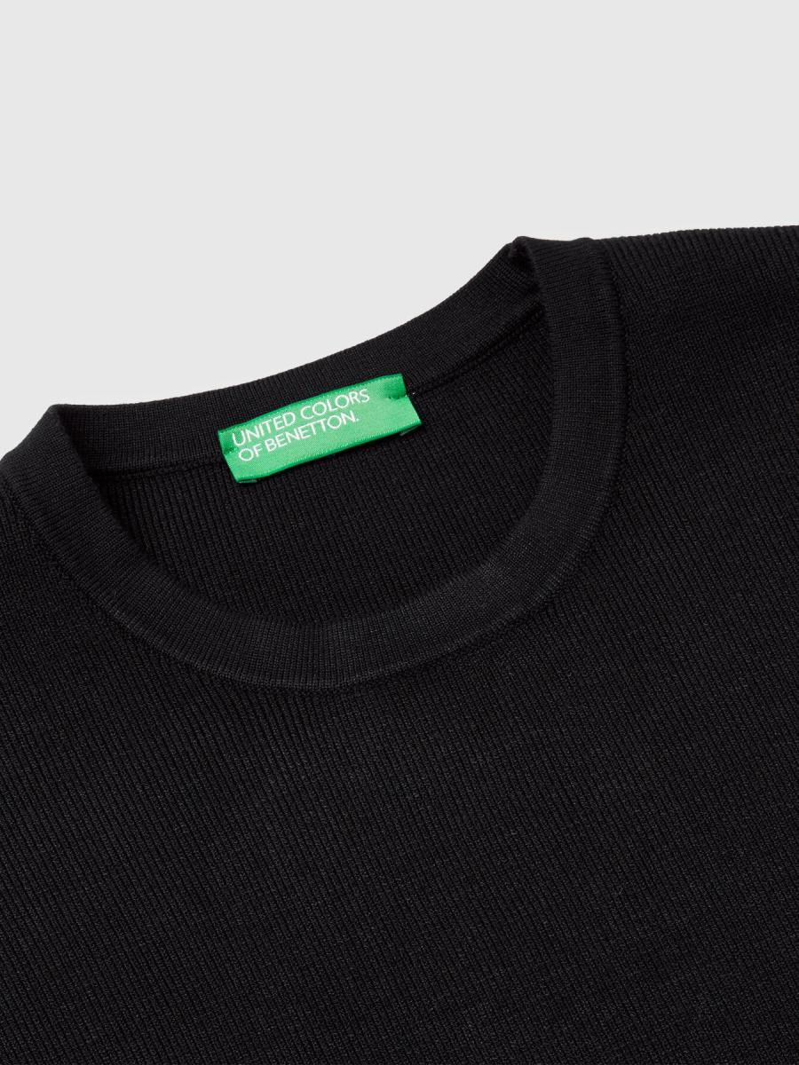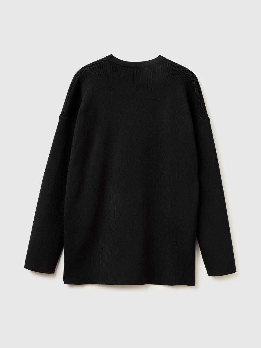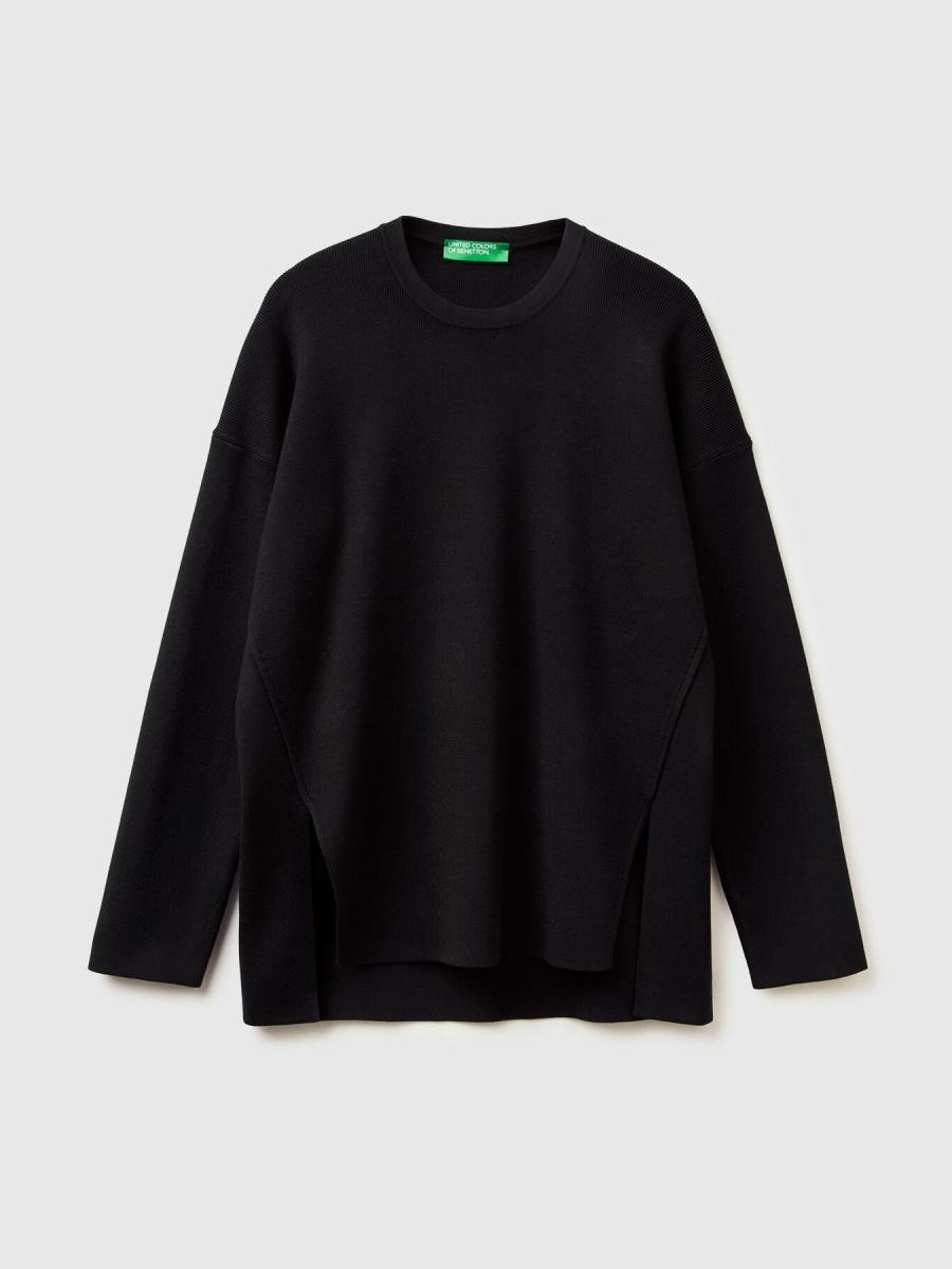 Džemper sa dugim rukavima i okruglim izrezom. Ravan donji deo sa prorezima, duži pozadi.