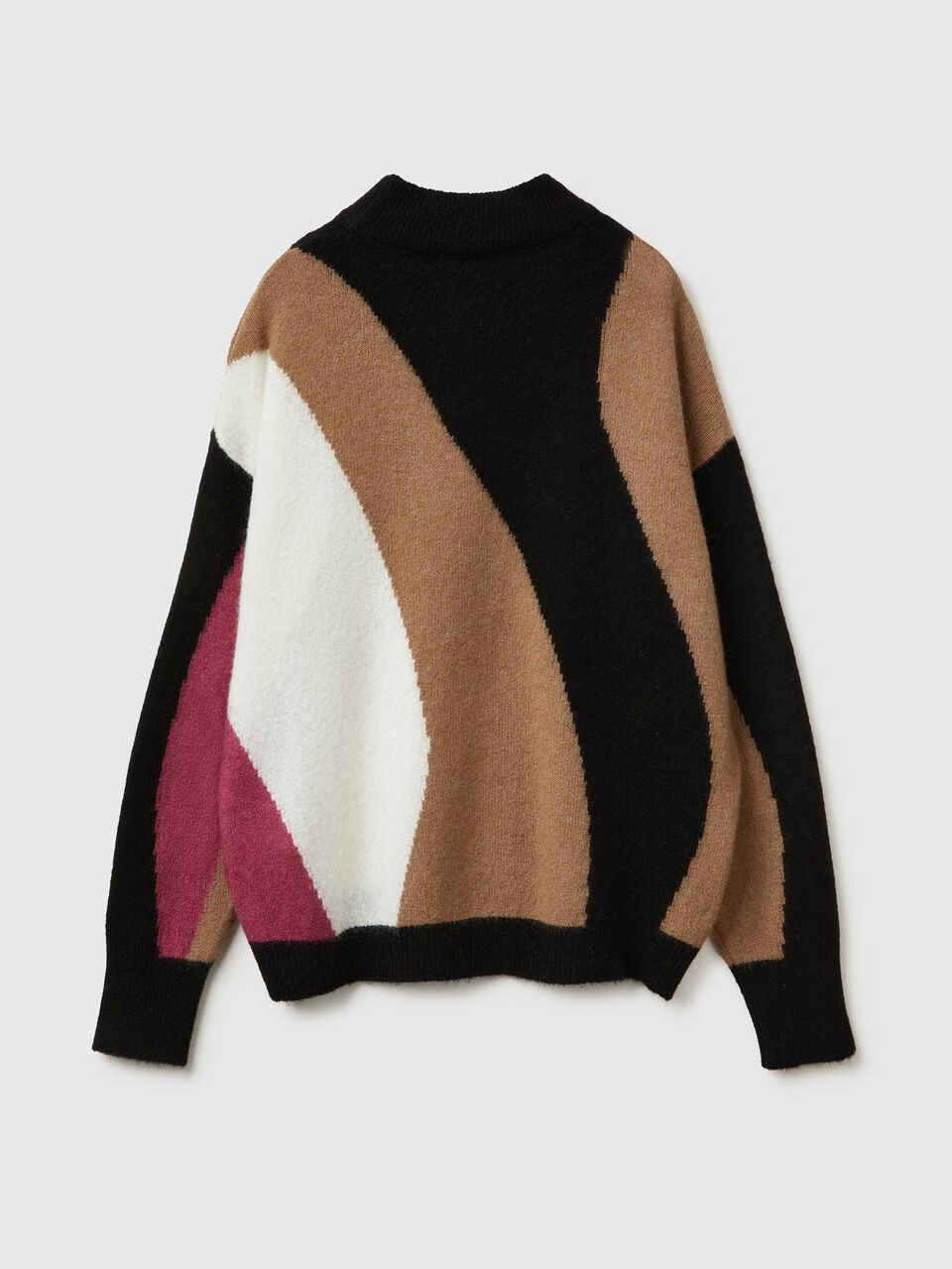 Džemper dugih rukava sa okruglim izrezom od rastegljive mešavine vune. Uskogran kroj i šareni umeci po celoj odeći. Svestran, a opet poseban, savršen za hladnu sezonu.