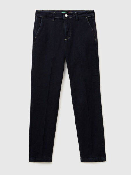 Duge pantalone „mom kroj“ od recikliranog pamučnog teksasa. Model sa pet džepova i otvaranjem pomoću rajsferšlusa i dugmeta.