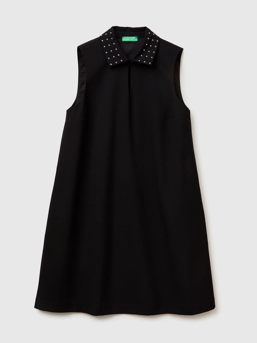 Kratka haljina bez rukava od rastezljive mešavine viskoze. Šiljata kragna sa kopčama, otvor za ključaonicu na prednjoj strani sa svetlucavim dugmetom, skriveni patent zatvarač sa jedne strane. Cool i moderan, savršen za zabave i posebne prilike.