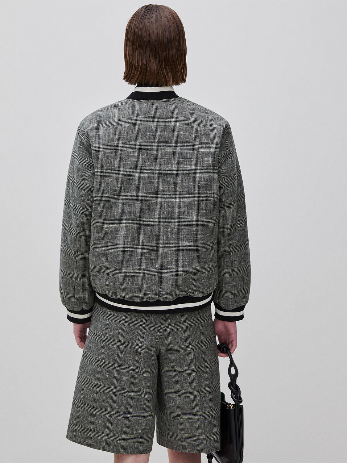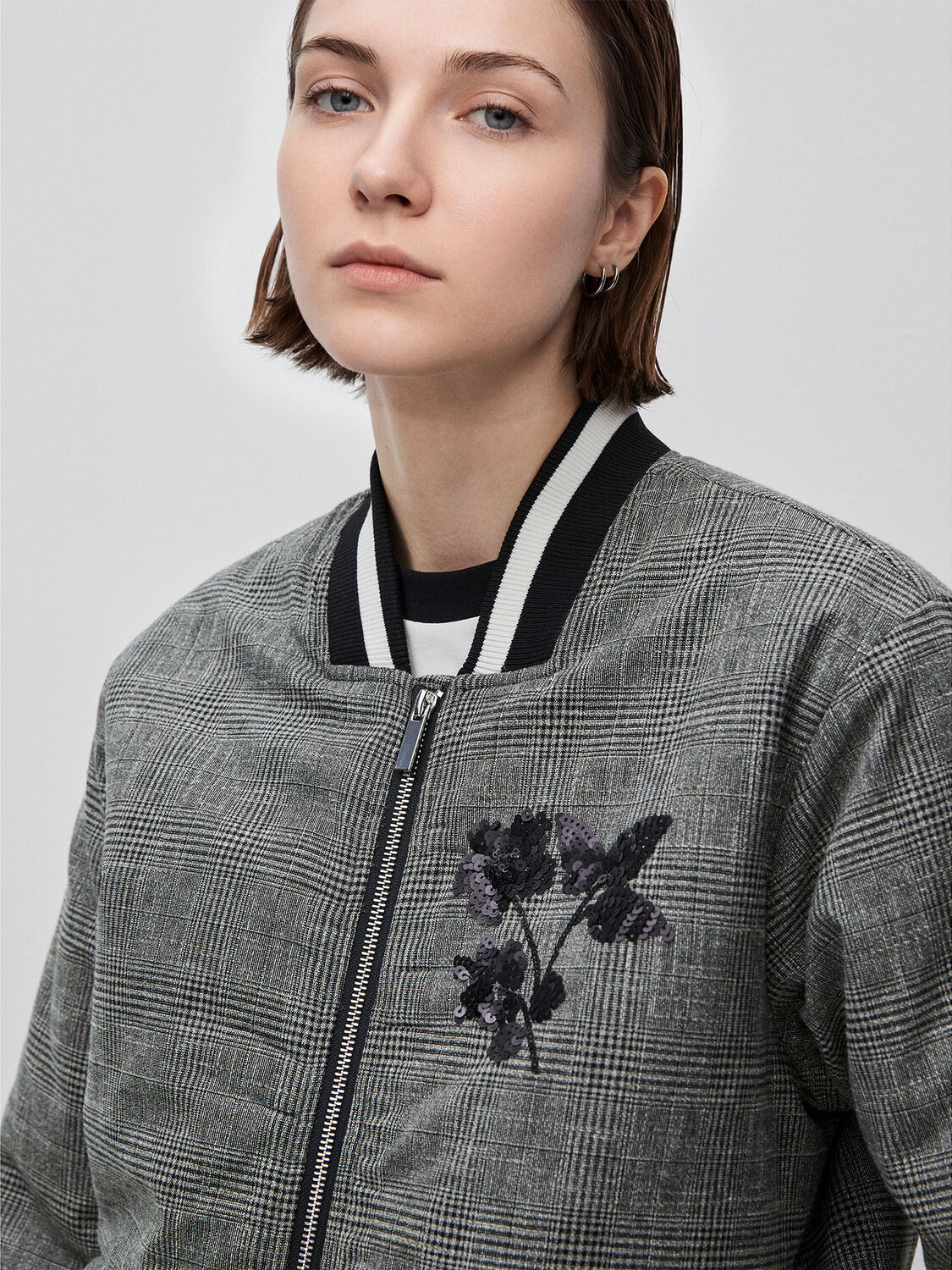 Bomber jakna od meke mešavine pamuka i lana, sa laganim punjenjem. Motiv princa od Velsa i cvetni vez sa šljokicama na levoj strani grudi. Zatvaranje patentnim zatvaračem i prednji džepovi sa preklopom. Klasik ponovo viđen sa modernim preokretom i blistavim dodirom.