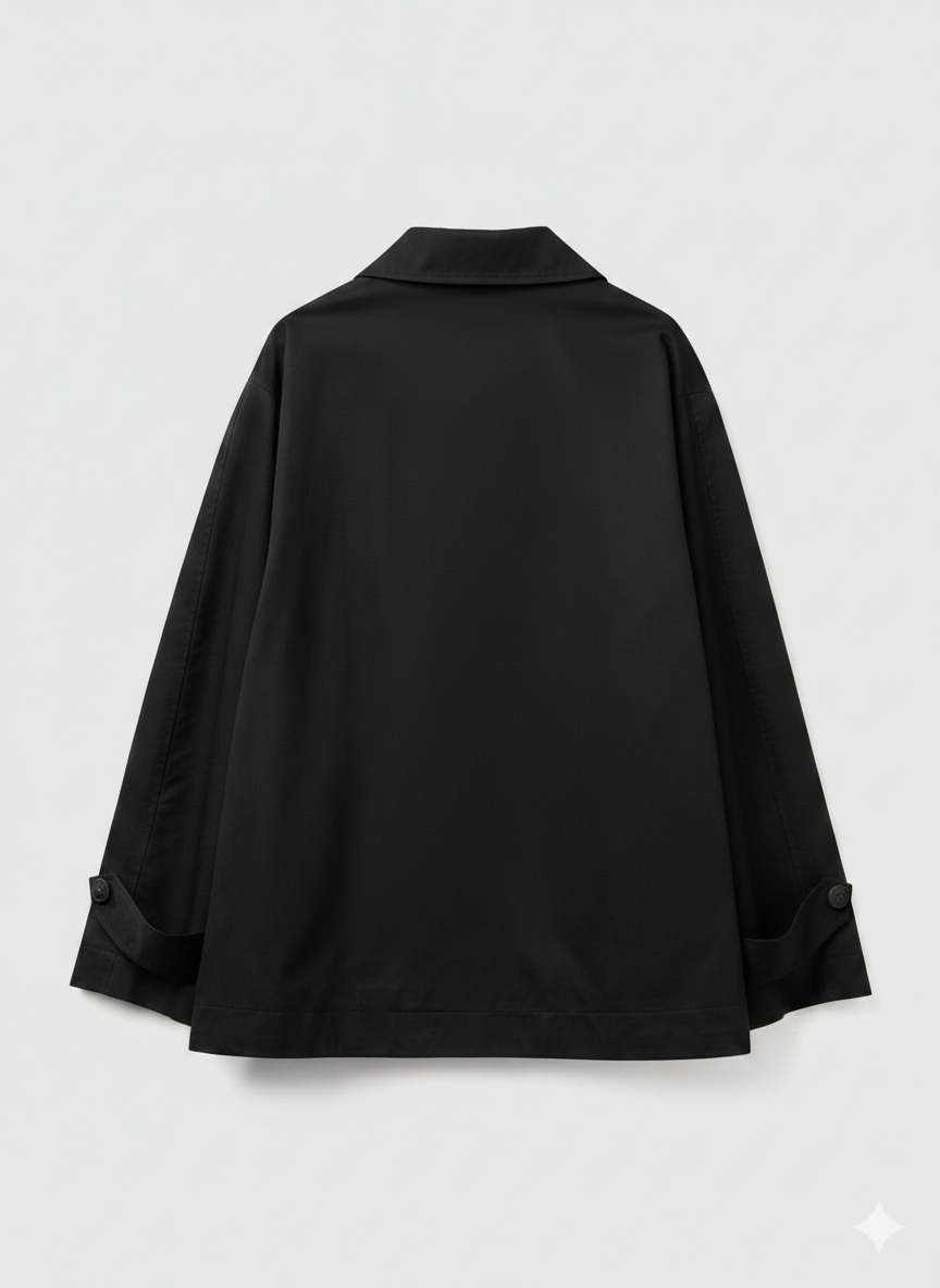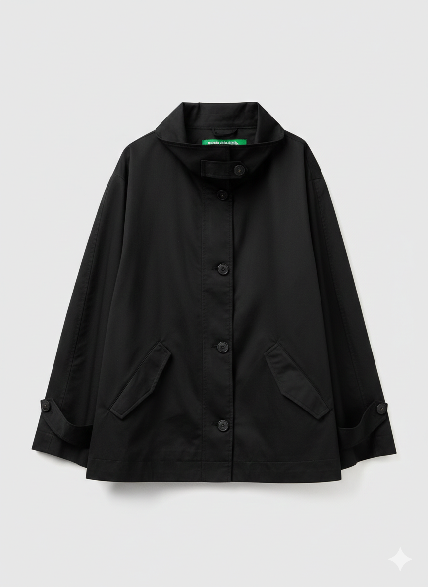 Postavljeni kaput od meke, čisto pamučne tkanine. Zvonasti kroj na donjem delu, visoko presavijen preko vrata sa kopčom. Praktično otvaranje napred sa dugmadima i prednjim džepovima sa preklopom. Za klasičan i udoban izgled, idealan za sredinu sezone.
