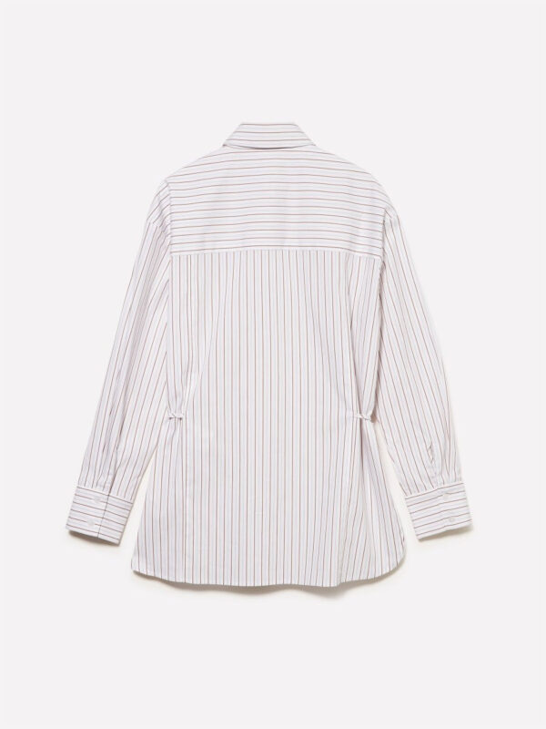 Lepršava košulja dugih rukava od prugaste viskoze i pamučne viskoze obojene pređom sa blago talasastim izgledom. Uobičajeno krojenje sa klasičnom kragnom i dugmadima sa zlatnim završetkom. Elegantan i originalan.