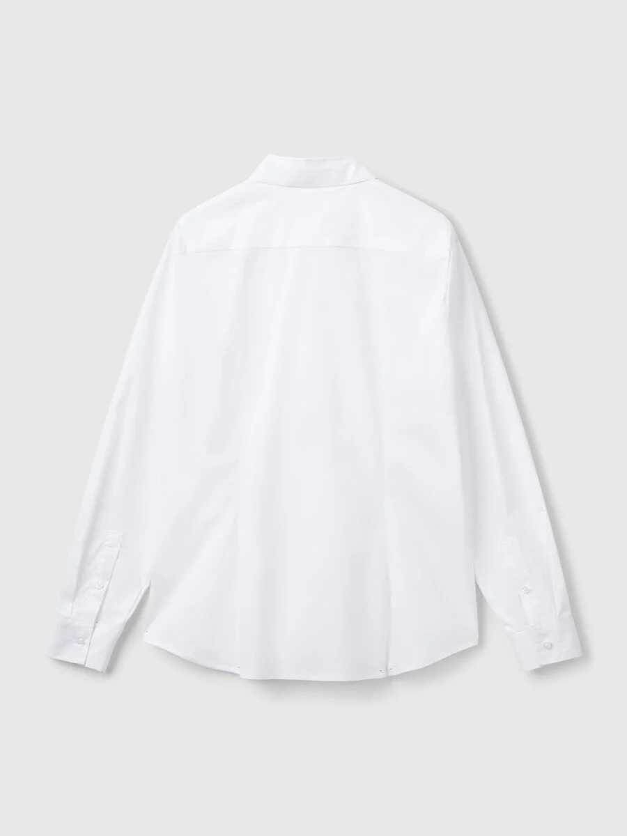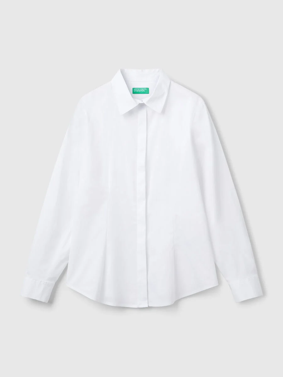 Uska košulja dugih rukava od rastegljive mešavine pamuka. Klasična kragna i skriveno zakopčavanje sa prednje strane. Neophodan komad odeće, savršen za svakodnevnu odeću.