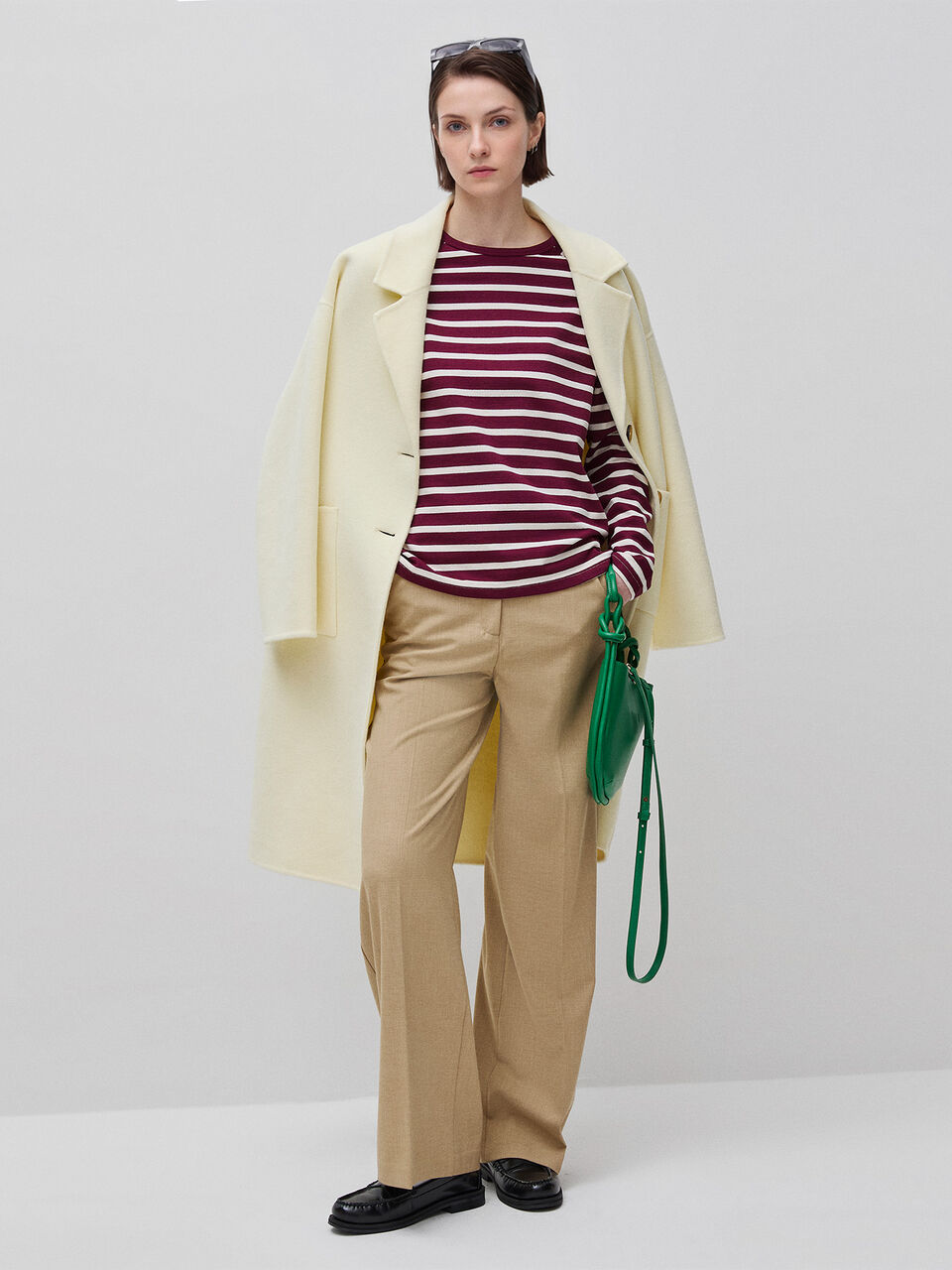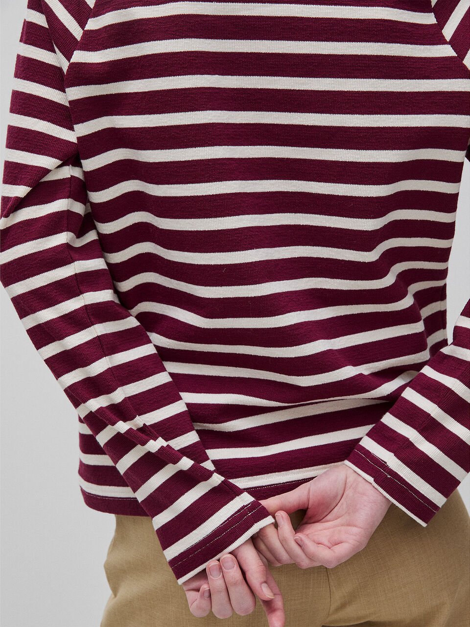 Dukser sa okruglim izrezom od čistog pamuka sa horizontalnim prugama obojenim pređom. Dugi raglan rukavi i normalnog kroja. Za casual-šik odeću.