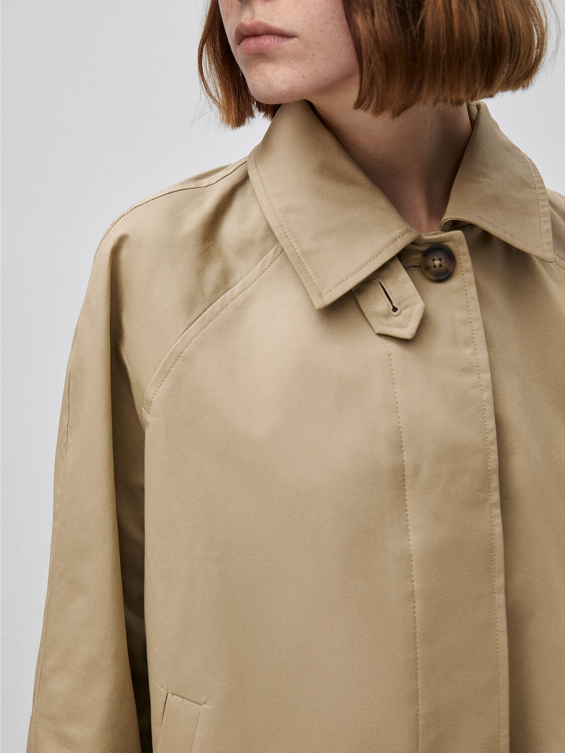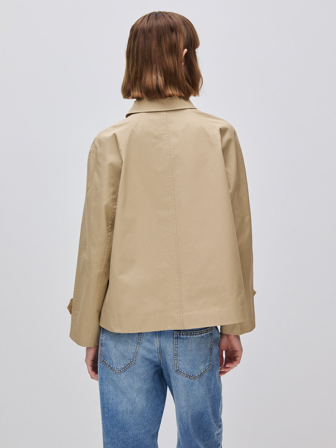 Kratki kaput od čistog pamuka sa prugastom postavom. Ima šiljastu kragnu, rukave na preklop i skriveni prednji deo sa otvorenim gornjim dugmetom. Rašireni kroj i opušten kroj čine ga obaveznim za prelaznu sezonu.