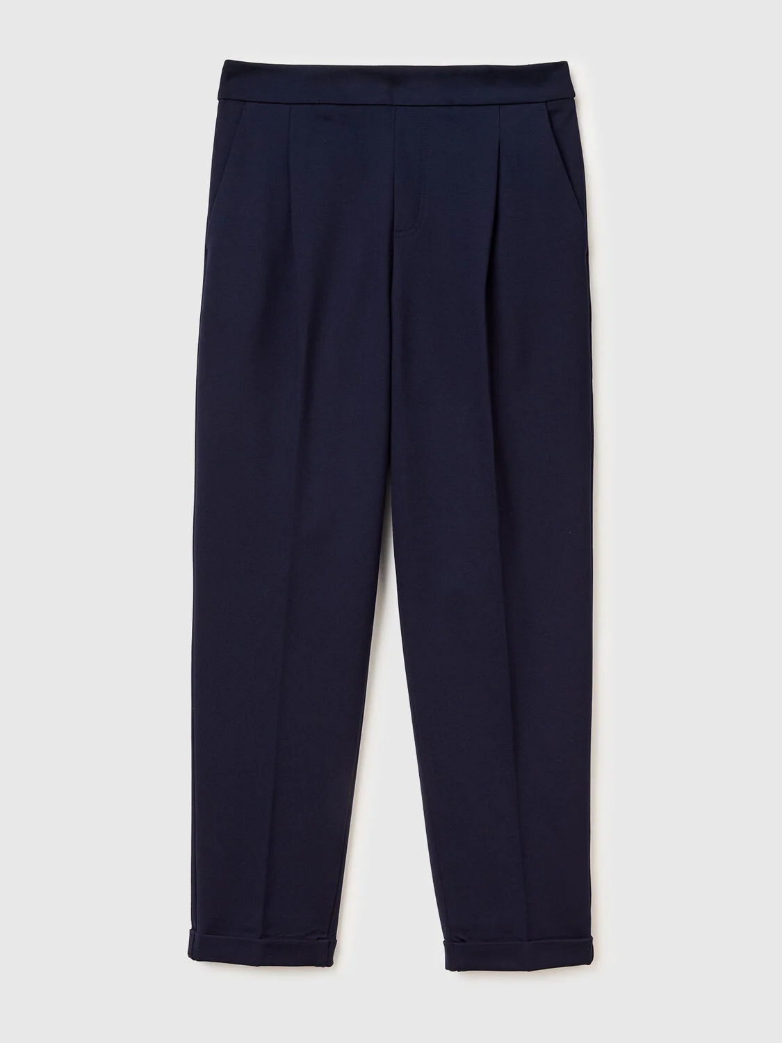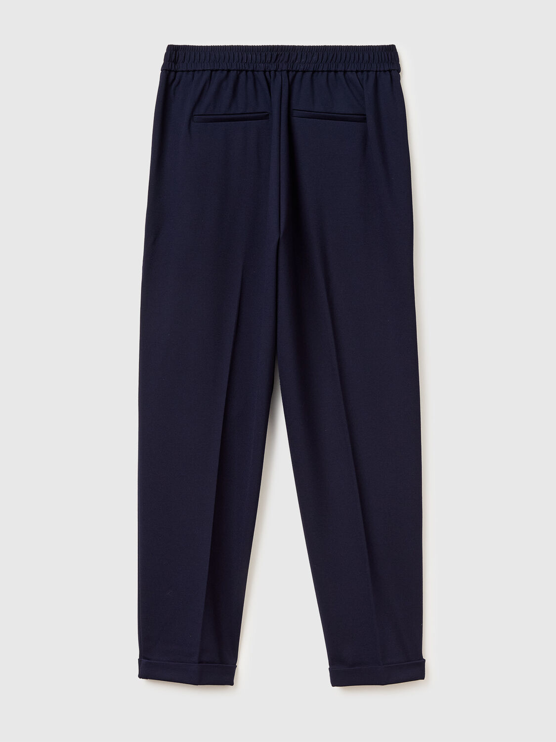 Duge pantalone od meke rastegljive mešavine viskoze. Normalni kroj nogavica sa naborima i ispeglanim centralnim pregibom napred. Struk sa unutrašnjom lastišom na leđima i sa strane. Prednji džepovi i prošiveni džepovi pozadi.