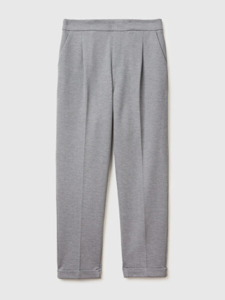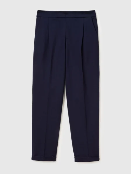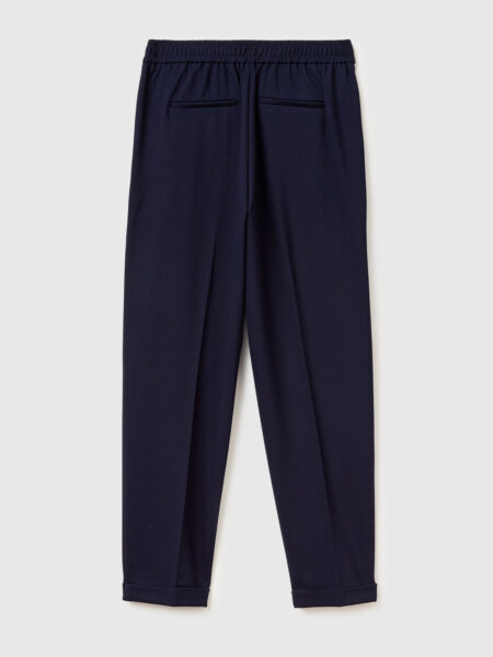 Duge pantalone od mešavine pamuka. Ravan i uski kroj sa centralno ispeglanim pregibom. Prednje otvaranje sa rajfeslusem i dugmetom, prednji džepovi i prošiveni džepovi sa dugmetom na leđima. Za moderan i ženstven izgled.