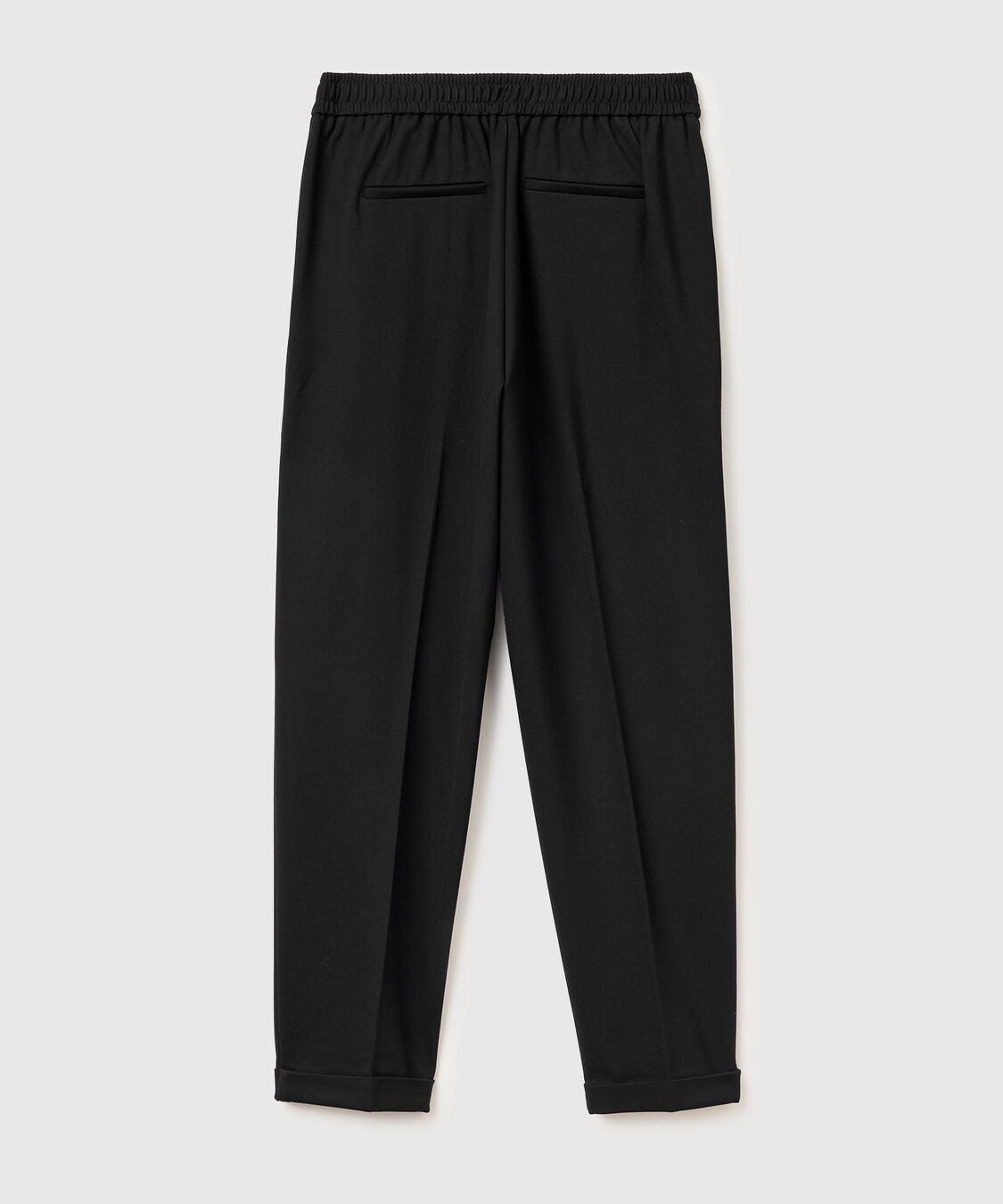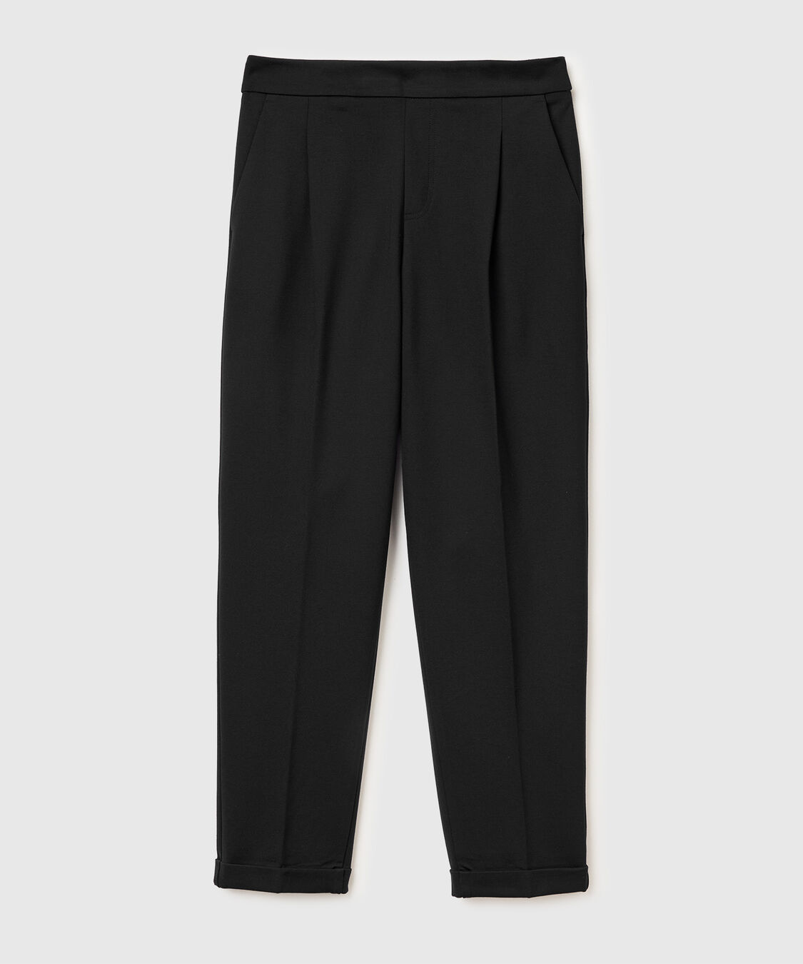 Duge pantalone od meke rastegljive mešavine viskoze. Normalni kroj nogavica sa naborima i ispeglanim centralnim pregibom napred. Struk sa unutrašnjom lastišom na leđima i sa strane. Prednji džepovi i prošiveni džepovi pozadi.