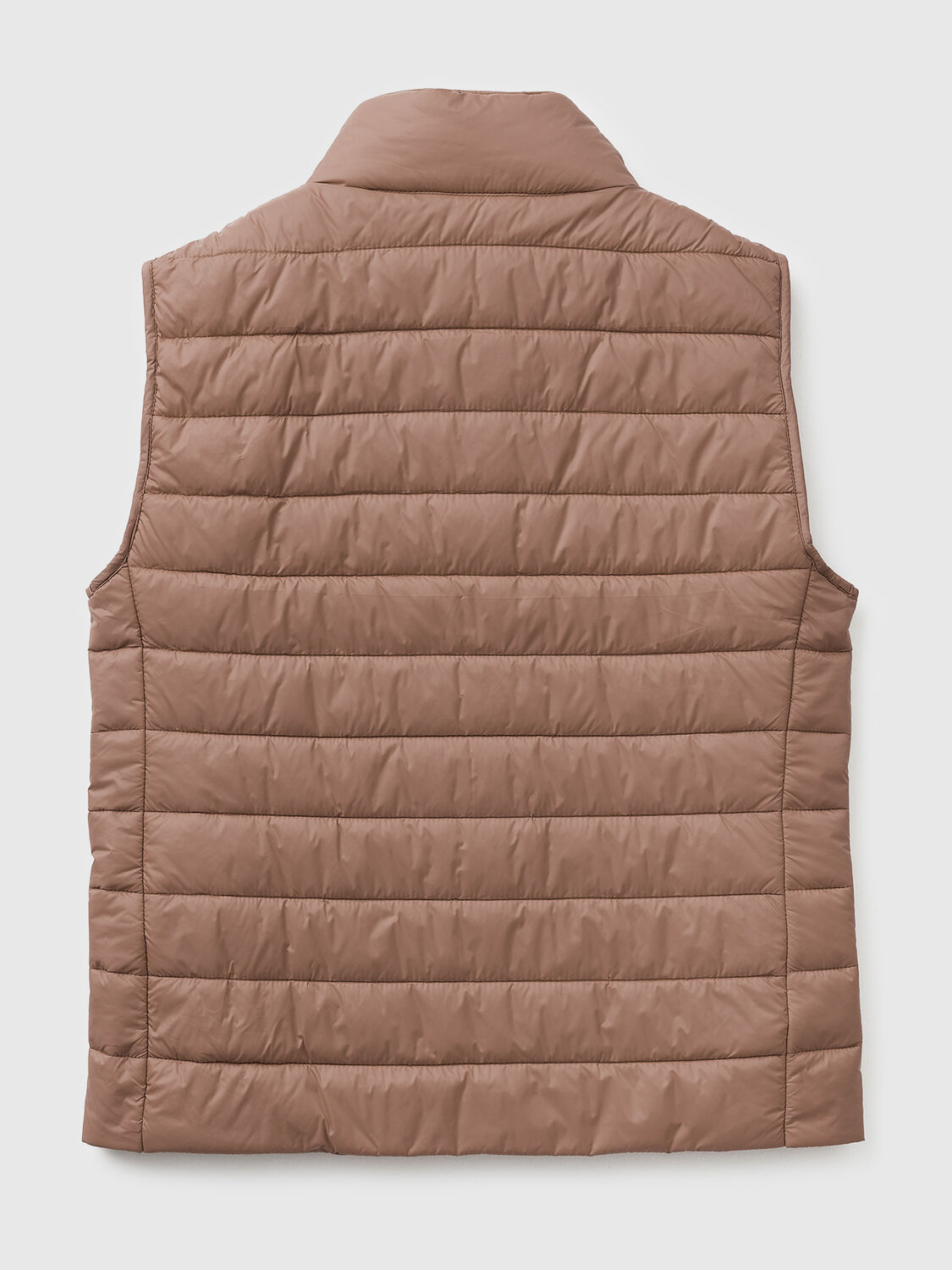 Lagana pufer jakna bez rukava od prošivenog najlona „Rain Defender“ uskog kroja. Stojeći vrat, otvor na patent zatvarač, umetnuti džepovi sa strane. Ova odeća sadrži 100% RCS sertifikovanu podlogu od recikliranog poliestera. SERTIFIKOVANO OD ICEA – ICEA – TKS – 611. Proizvodi sertifikovani prema Standardu za recikliranje (RCS) sadrže reciklirani sadržaj koji je nezavisno verifikovan u svakoj fazi lanca snabdevanja, od reciklaže do gotovog proizvoda.